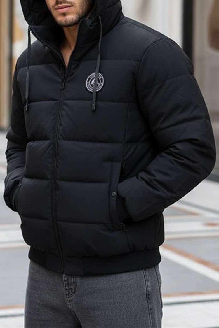 - Praktična i topla muška jakna sa amblemom, džepovima i kapuljačom sa podesivim vezicama, koja kombinuje udobnost i moderan urbani dizajn.