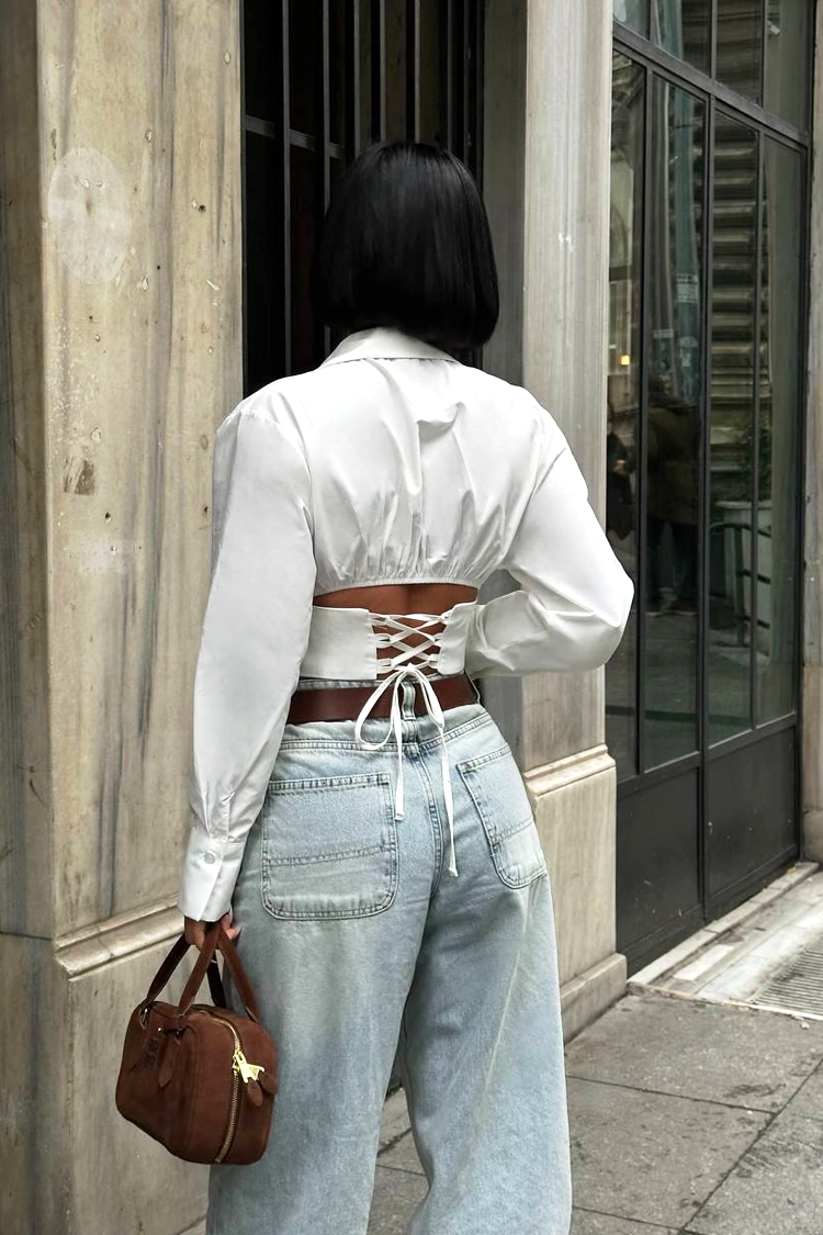 • Model ima uski kroj i vezice u struku pozadi.