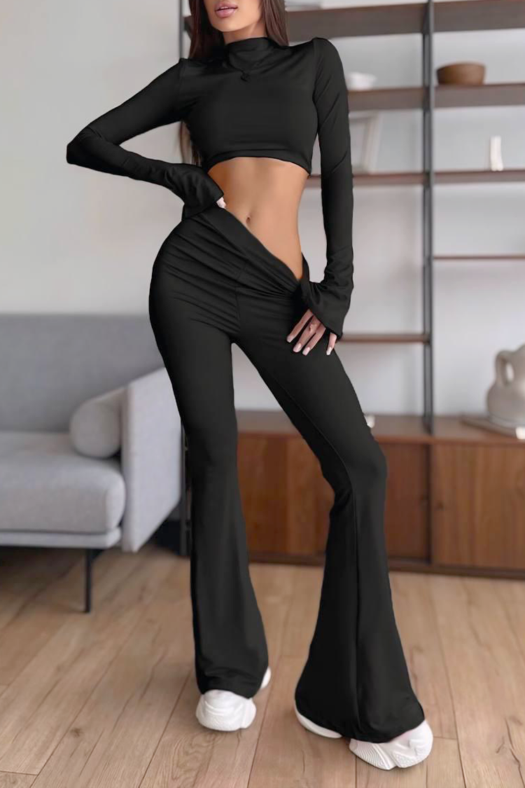 • Bluza je skraćene dužine, a pantalone su visokog struka i krojene uz telo.