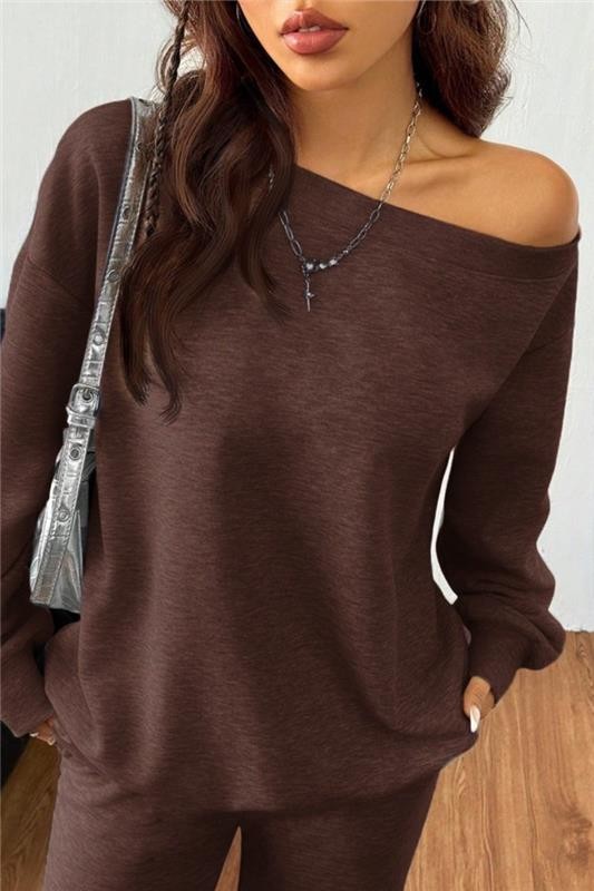 - Bluza ima spuštena ramena i ležeran kroj, a pantalone visok struk i široke nogavice.