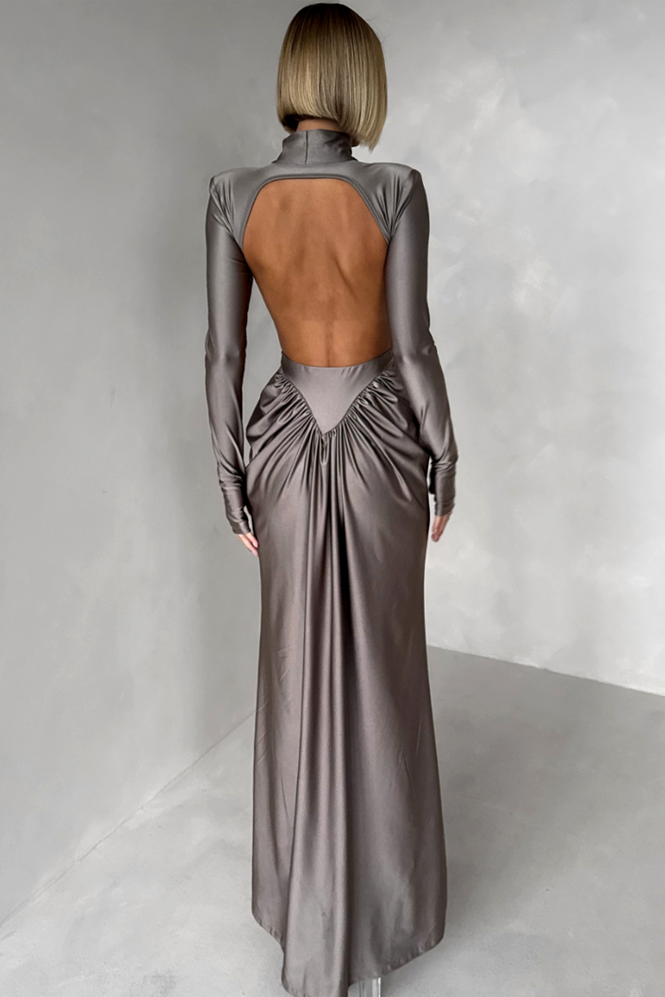 - Model ima duge rukave, elegantan kroj, efektan nabor i gola leđa.