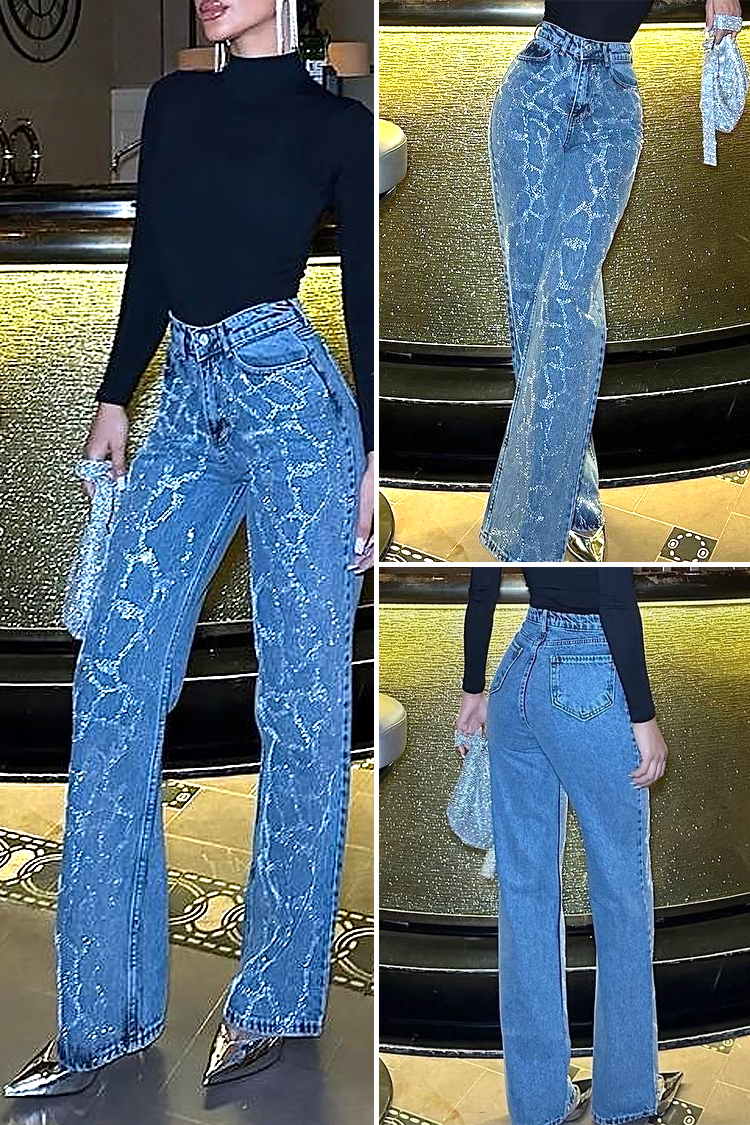 - Model ima visok struk, široke nogavice i sjajne elemente.