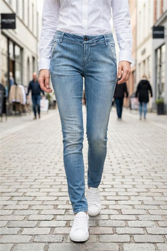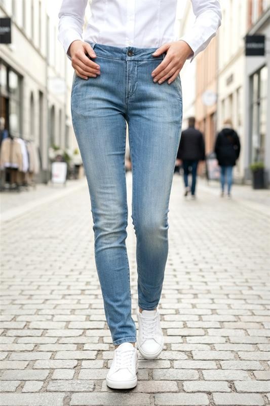 - Ženske farmerke basic modela u svetlo plavoj boji sa izbeljenim efektom, pogodne za svakodnevni život ili šetnju.