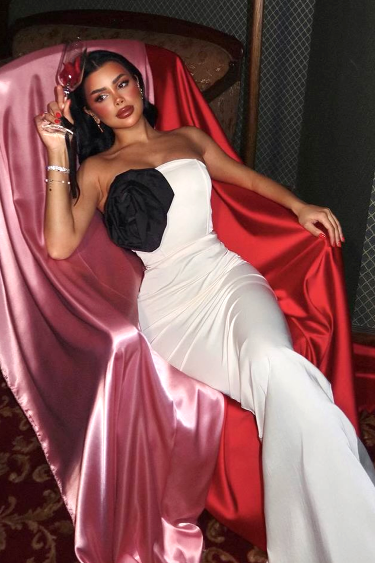 - Elegantna duga haljina u klasičnoj beloj boji sa 3D cvetnim akcentom na vrhu, pogodna za svečane prilike i koktele.