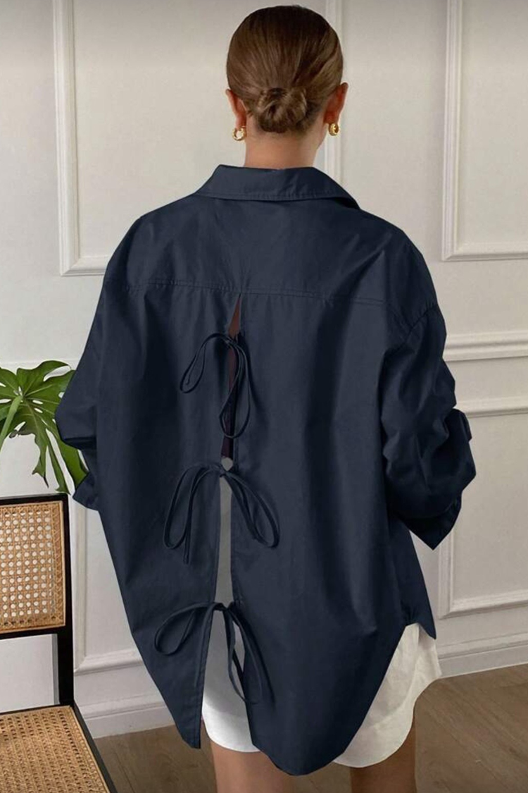 - Model ima duge rukave, oversize kroj, zakopčava se dugmadima napred i efektno je pozadi ukrašena mašnama.