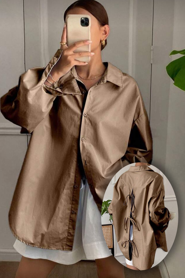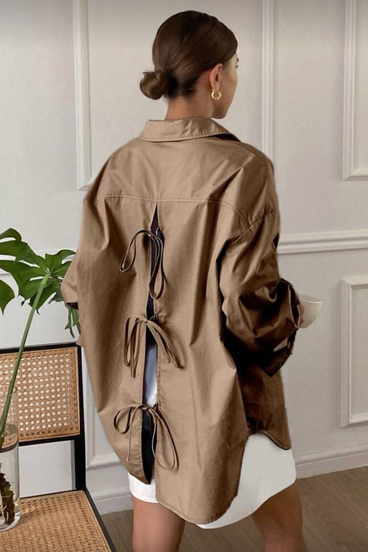 - Model ima duge rukave, oversize kroj, zakopčava se dugmadima napred i efektno je pozadi ukrašena mašnama.