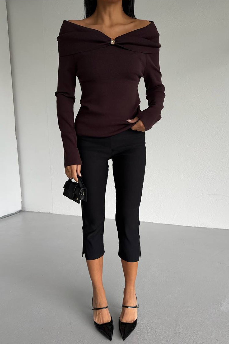 - Model ima duge rukave, uski kroj, jednobojni dezen i atraktivan dizajn sa metalnim detaljem na prednjoj strani.