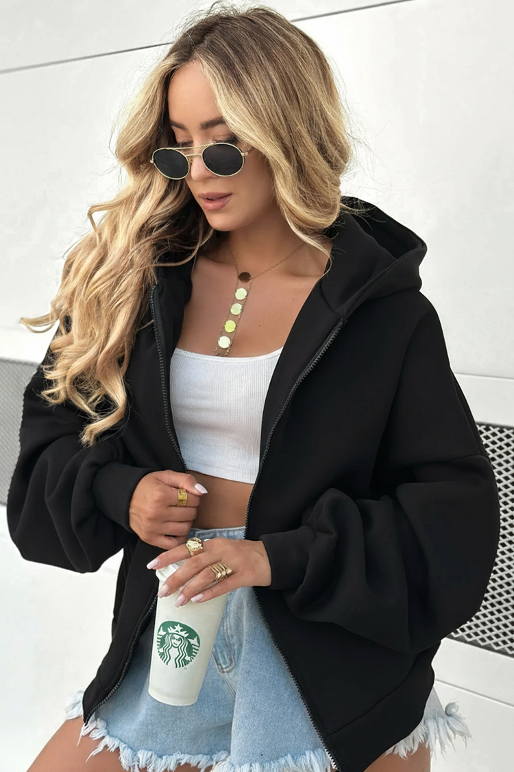 • Model ima jednobojni dezen, bočne džepove, kapuljaču i overize kroj.