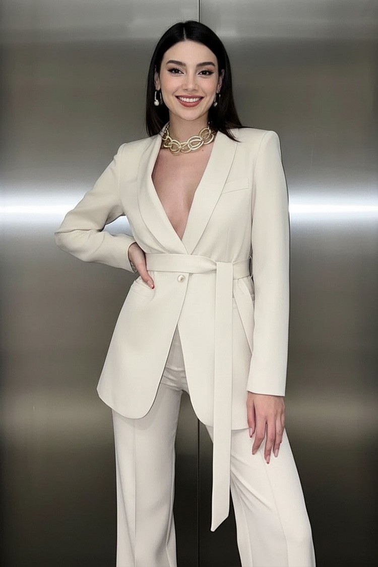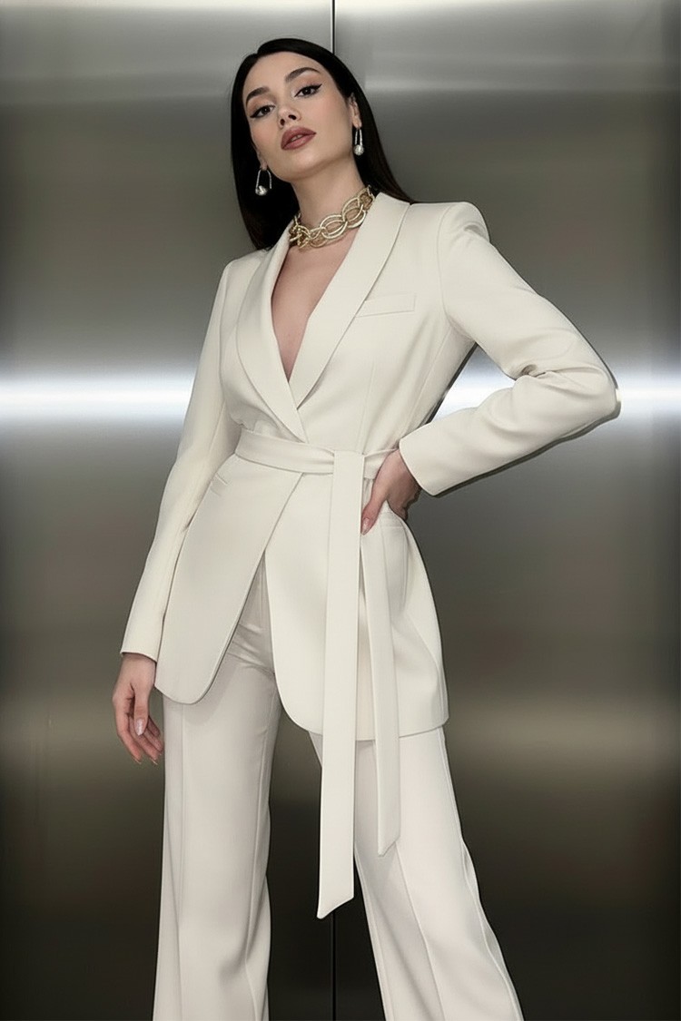 - Sako ima dugme na prednjoj strani i tekstilni kaiš u istoj boji. Pantalone imaju visok struk, elegantan kroj i široke nogavice.