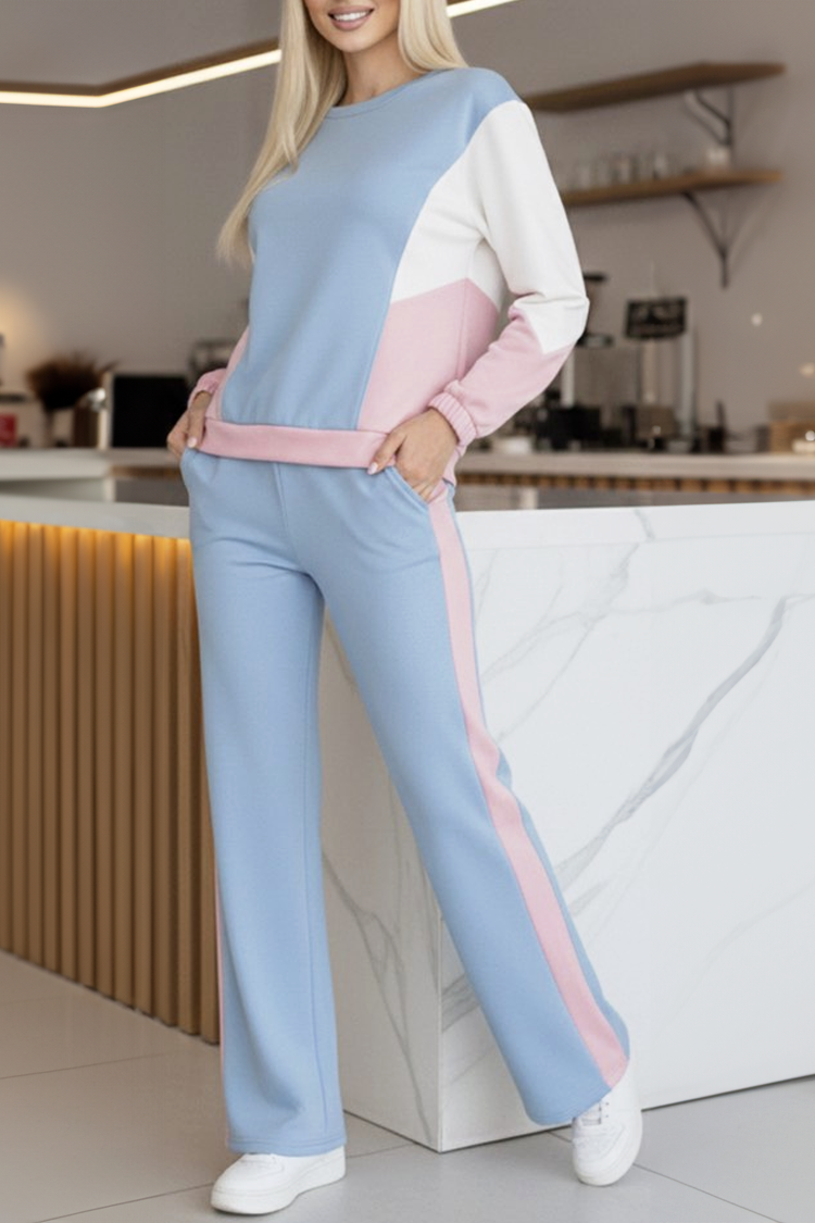 - Bluza ima okrugli dekolte i udoban kroj, a donji deo ima visok struk i duge nogavice.