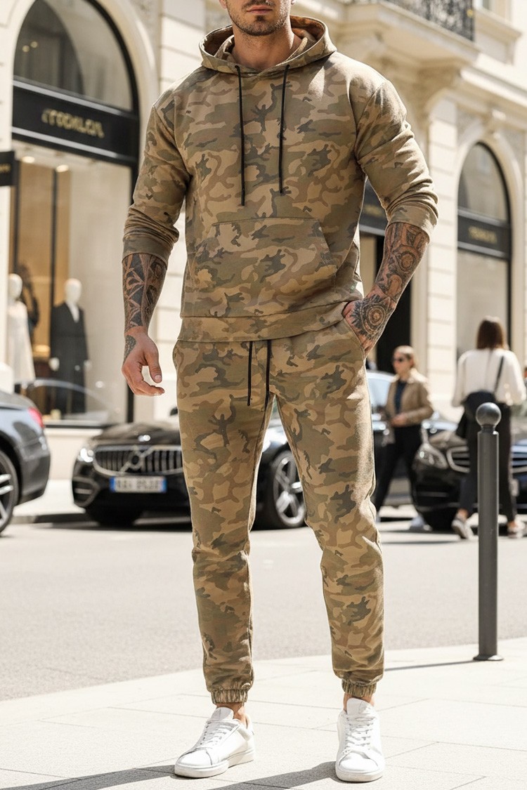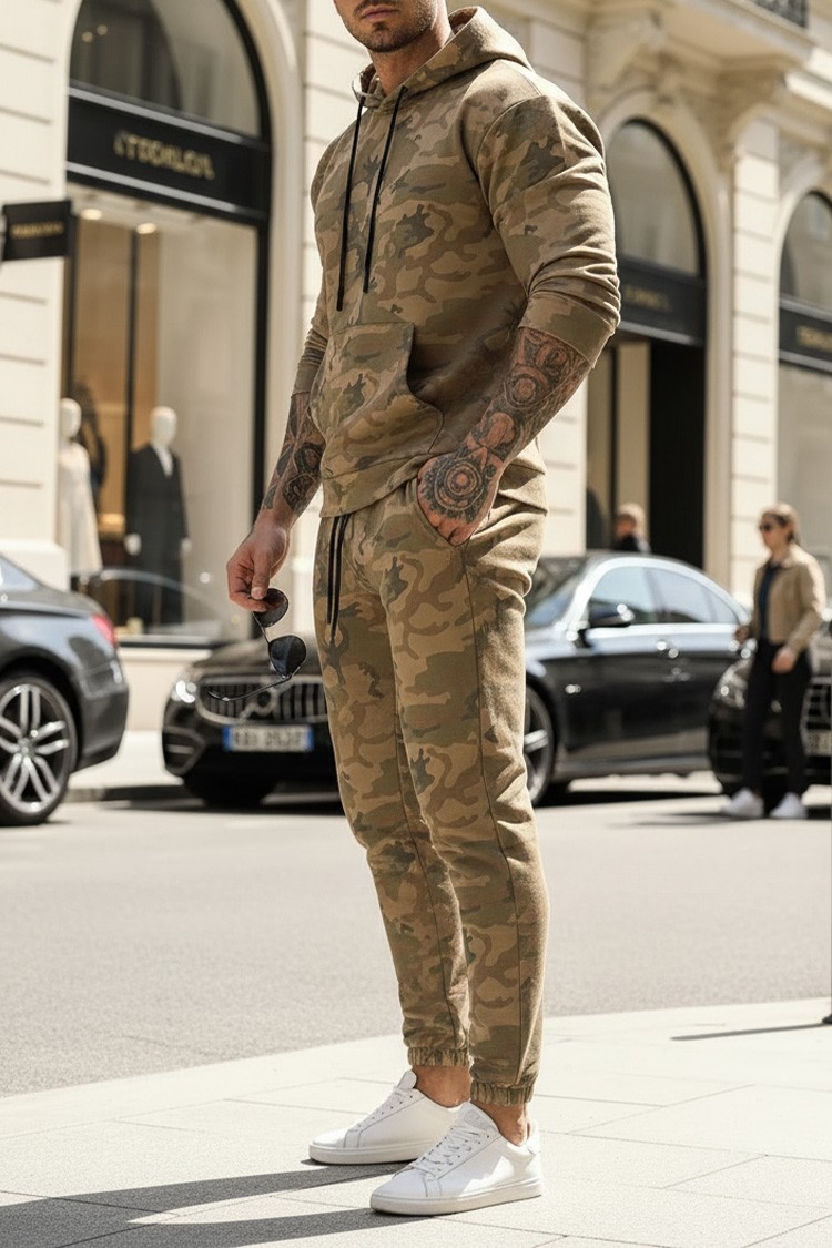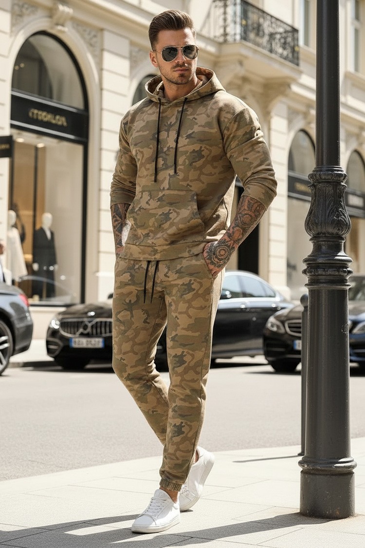 - Udoban muški dvodelni komplet sa kamuflažnim dezenom, koji se sastoji od dukserice i pantalona.