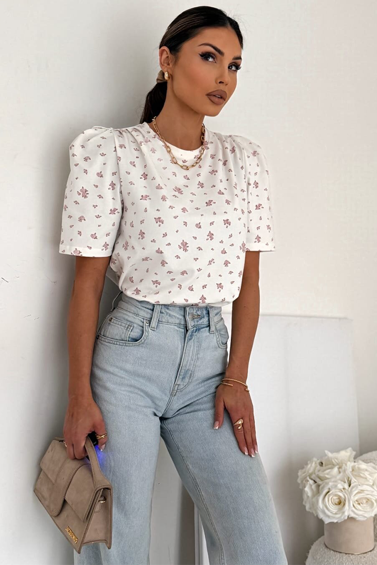 - Model ima kratke i uredne rukave, okrugli dekolte, precizan kroj i cvetni dezen.