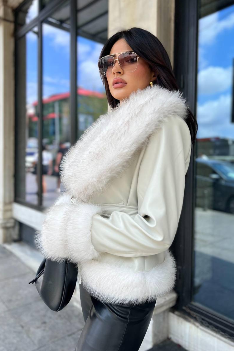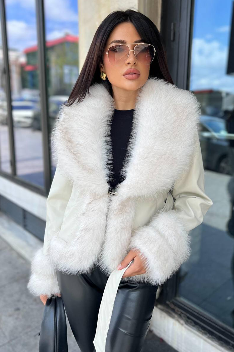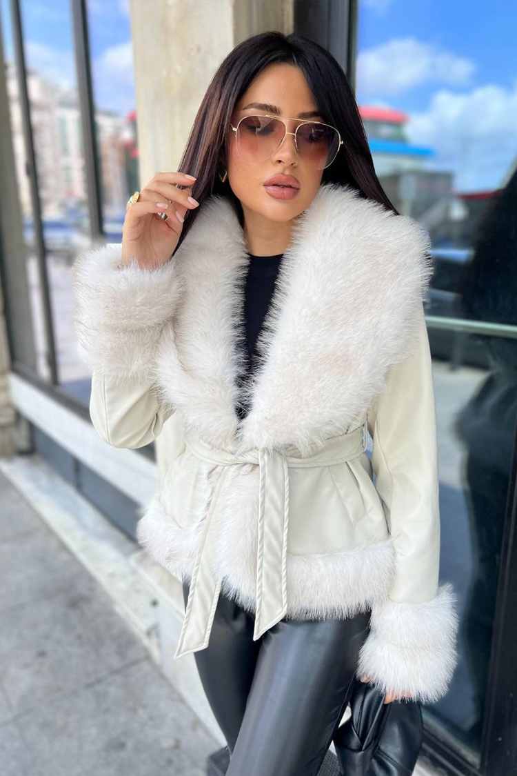 - Model je izrađen od eko kože, voluminozne kragne sa krznom, trendi boje i kaiša od iste tkanine.