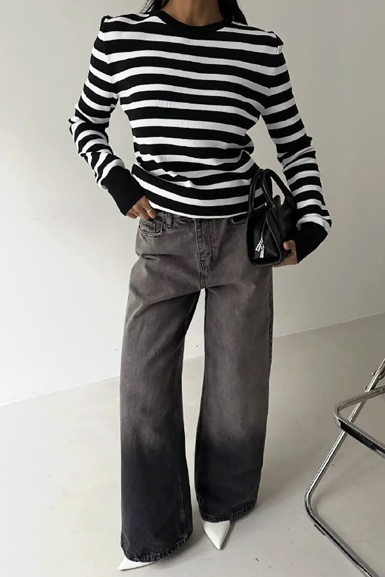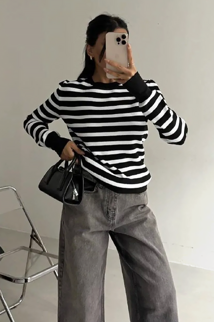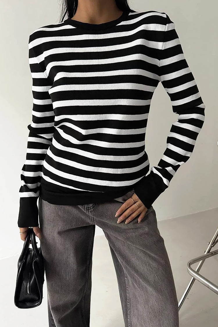 - Model ima duge rukave, klasičan kroj i prugasti dezen.