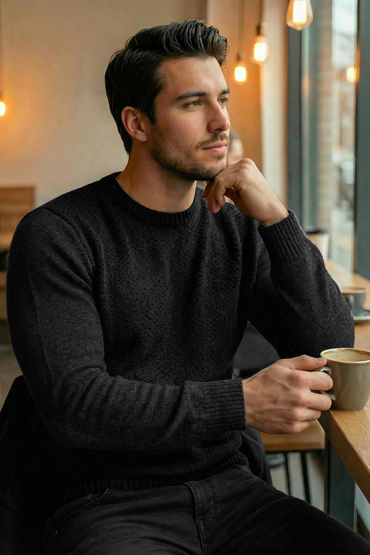 - Klasičan muški džemper sa okruglim dekolteom, pogodan kao dodatak svakodnevnoj odeći.
