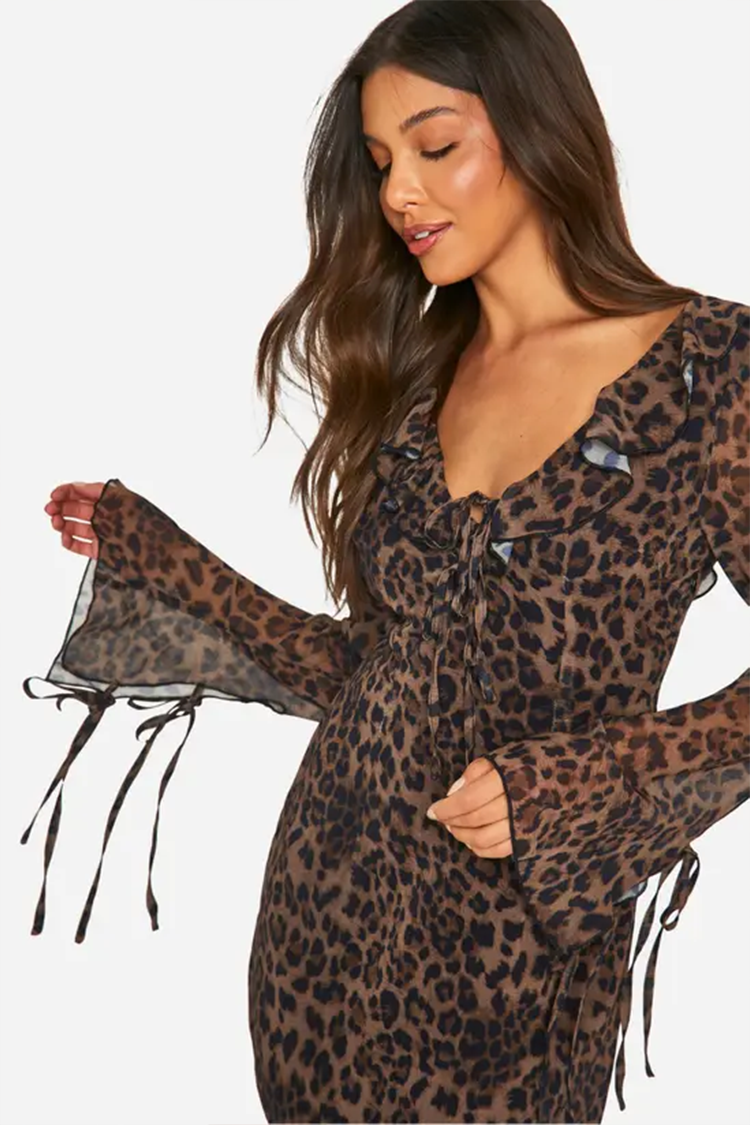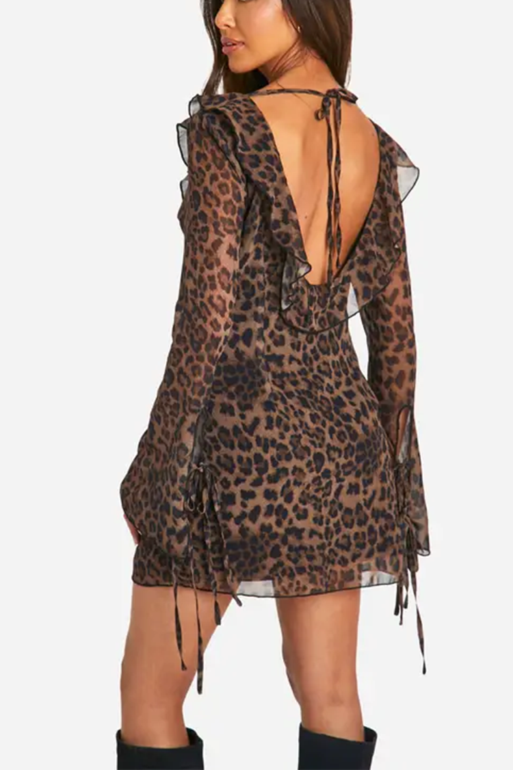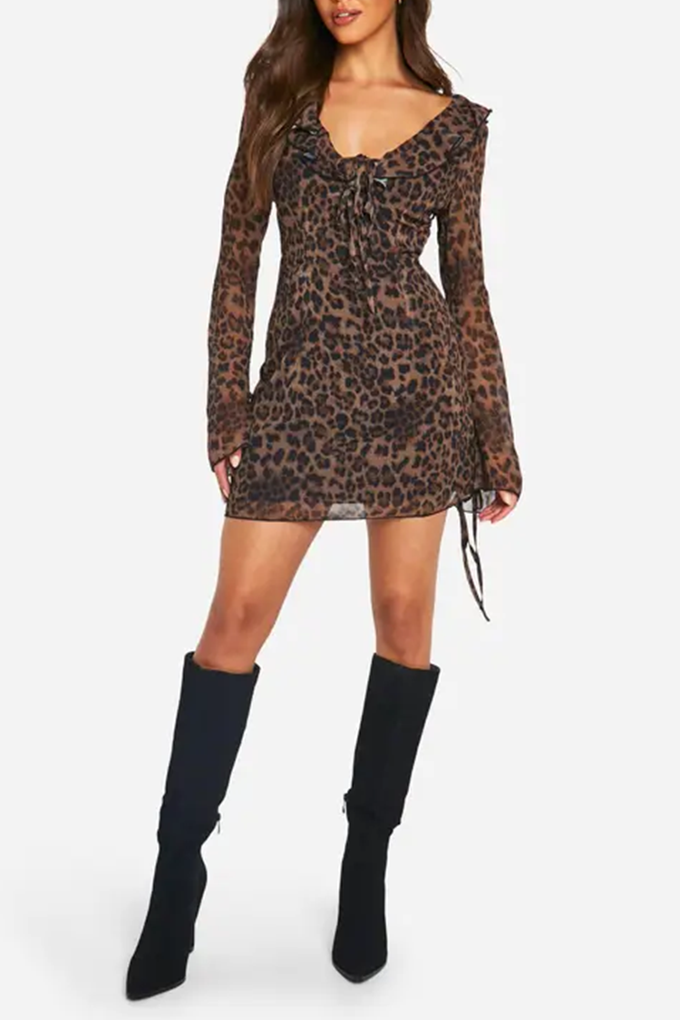 - Haljina ima atraktivan kroj, leopard print, duge rukave i pertle.