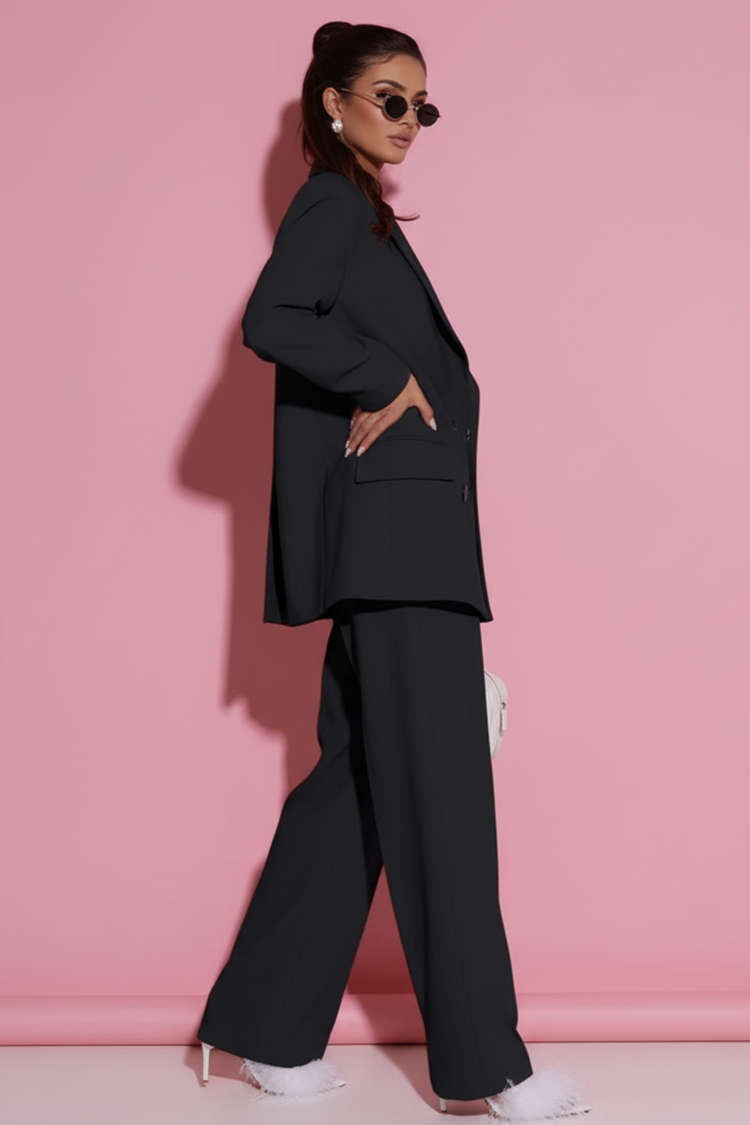 • Sako ima dvoredno kopčanje, duge rukave i elegantnu kragnu. Pantalone imaju visok struk, elegantan kroj i široke nogavice.