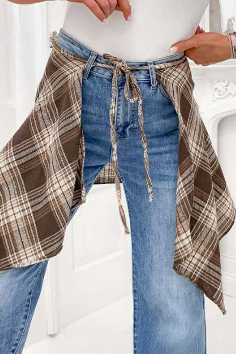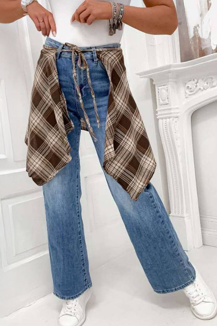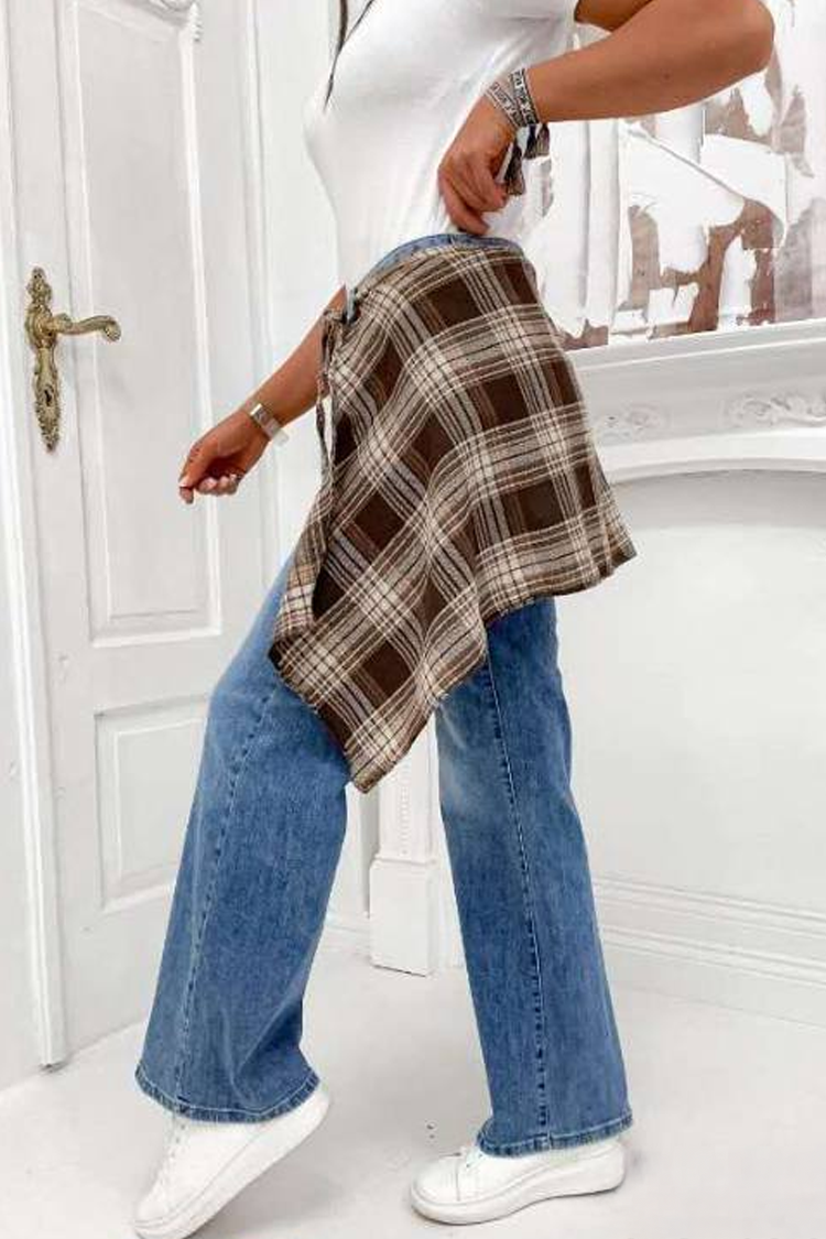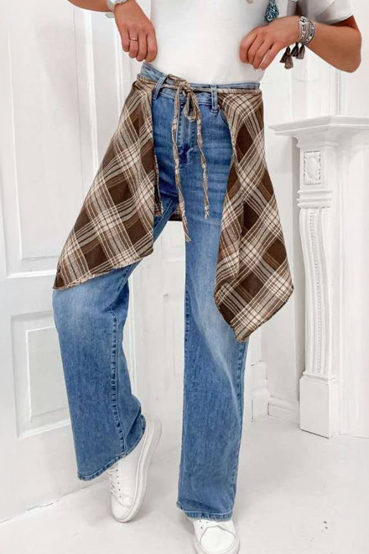 • Model ima visok struk, široke nogavice, bočne džepove i atraktivan šal sa kariranim dezenom.