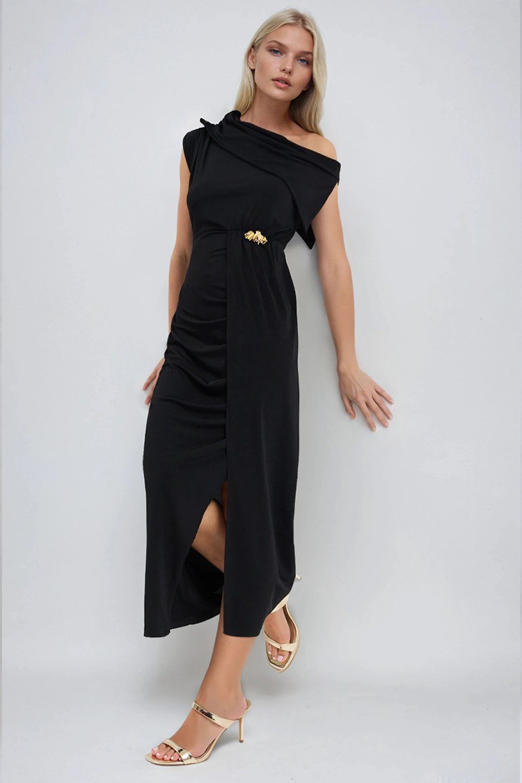 - Model ima elegantan kroj, metalni detalj na prednjoj strani, šlic i asimetrični dekolte.