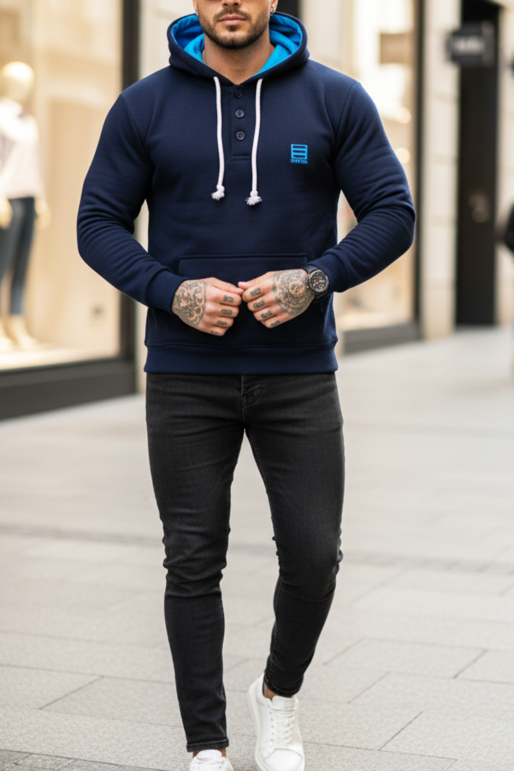 - Praktična muška dukserica sa dugmadima na dekolteu i kapuljačom sa vezicama, pogodna za svakodnevni život ili šetnju.