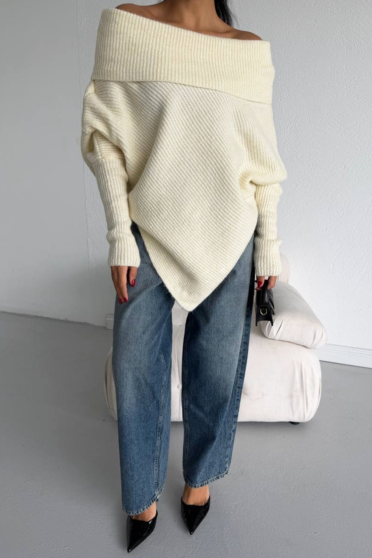 - Model ima oversize kroj, asimetričan dizajn i otvorena ramena.