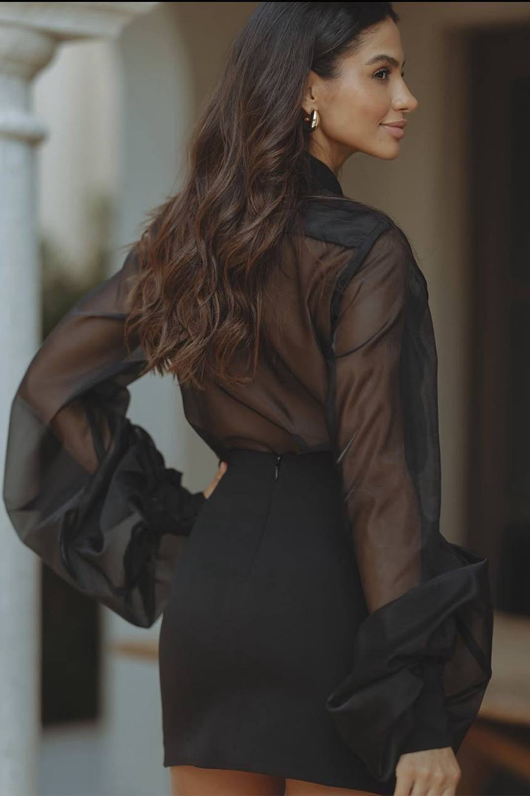 • Bluza ima duge pufnaste rukave, kragnu i providnu tkaninu, a suknja je kratke dužine i ima seksi uski kroj.