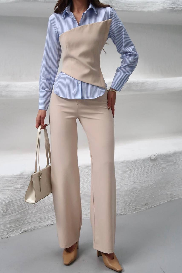 - Košulja ima klasičan kroj, prugasti dezen i kragnu, a gornji deo je bez bretela i seksi dizajna.
