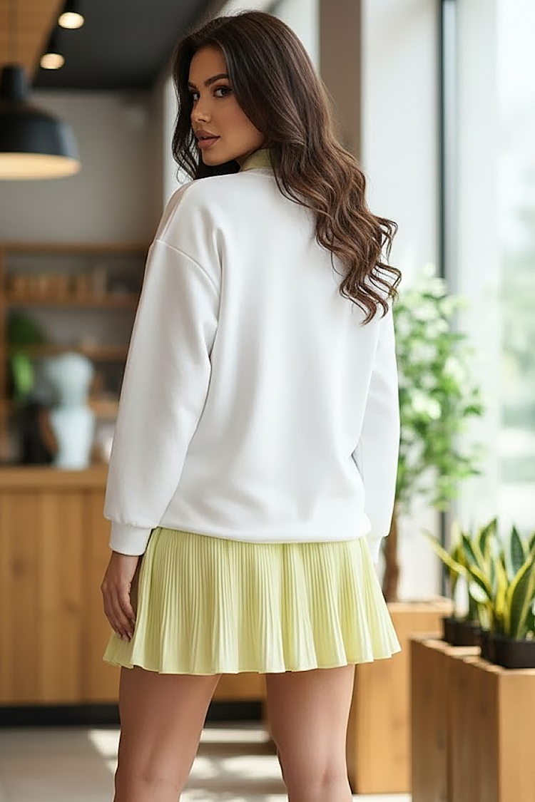 - Suknja je kratka i nabrana, a košulja ima klasičan kroj i kragnu.