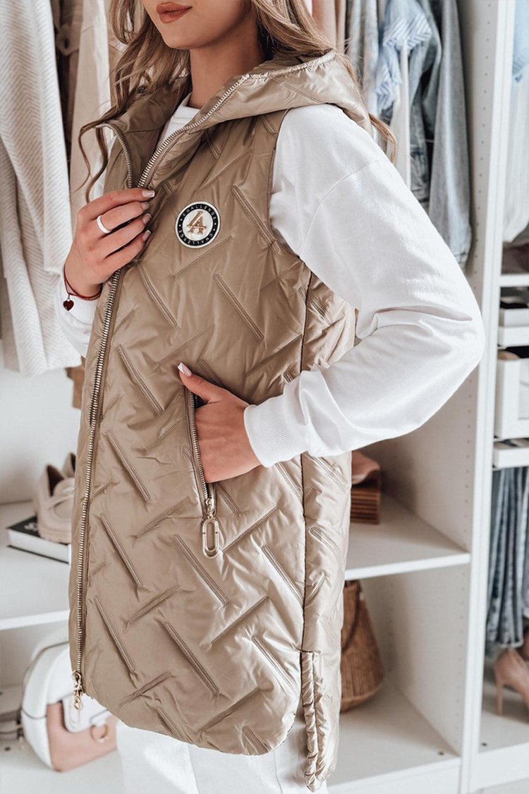 - Prsluk ima klasičan kroj, kragnu, džepove, prošiveni dizajn i kapuljaču.
