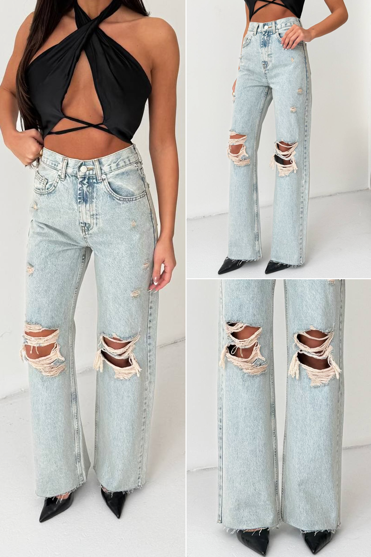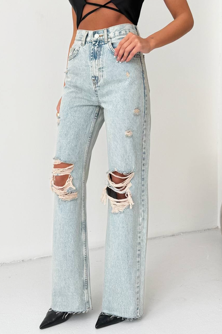 • Model ima visok struk, džepove, slobodan kroj, moderan pocepani efekat i svetloplavi dezen.