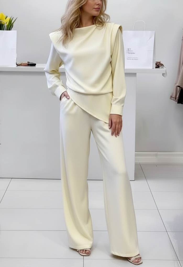 - Pantalone imaju visok struk, širok kroj i bočne džepove.