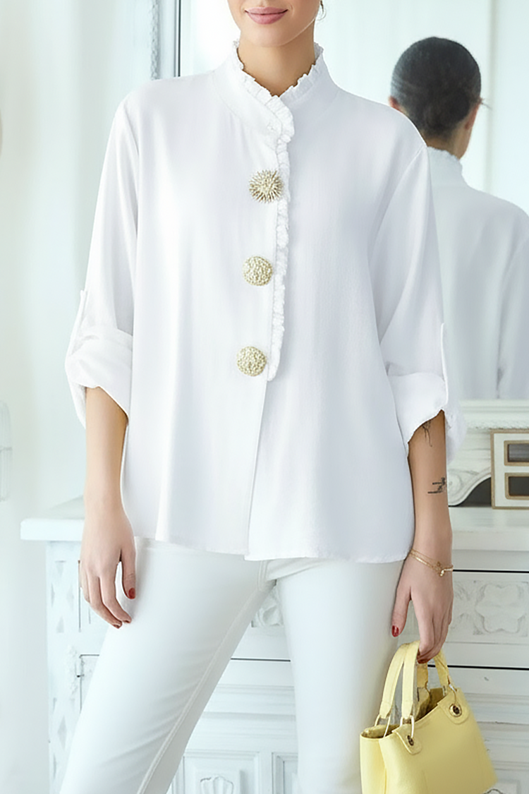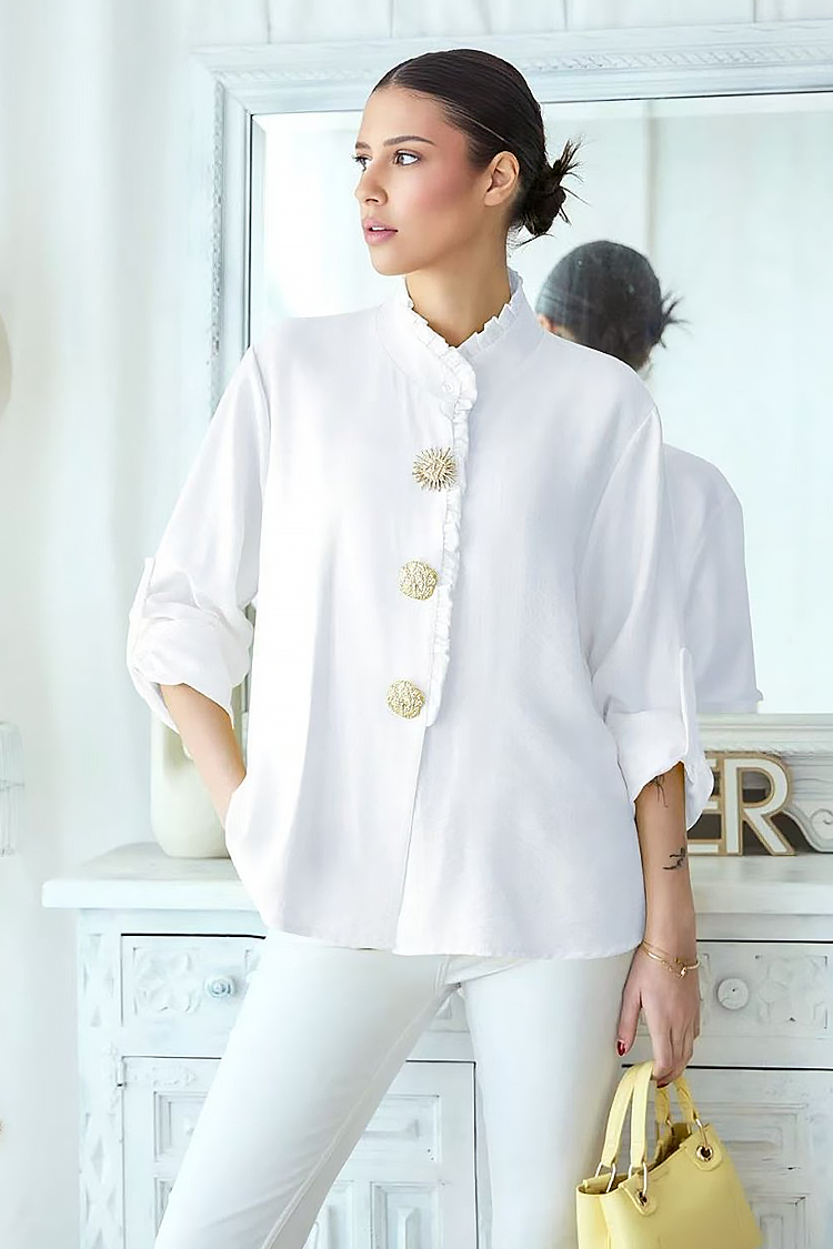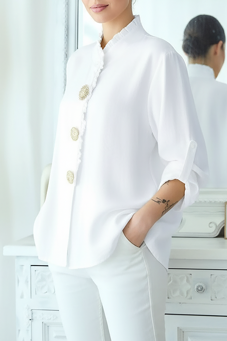 - Model ima duge rukave koji se mogu zasukati, efektnu kragnu i dugmad.