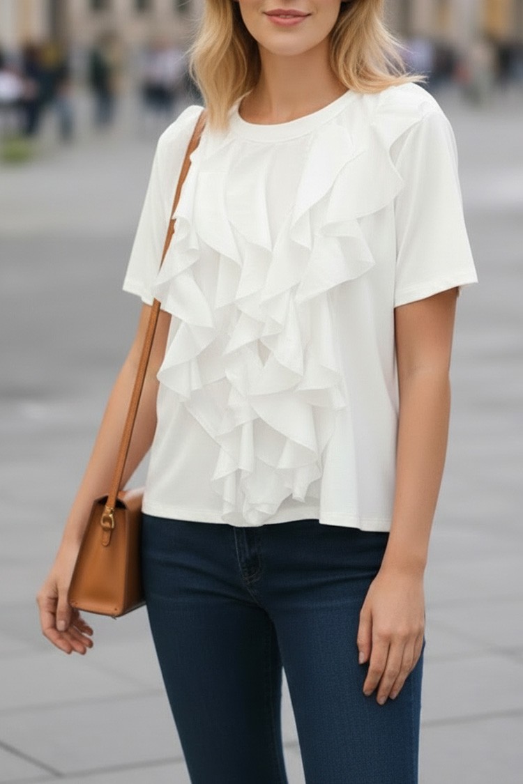 - Model ima kratke rukave, okrugli dekolte i udoban kroj.
