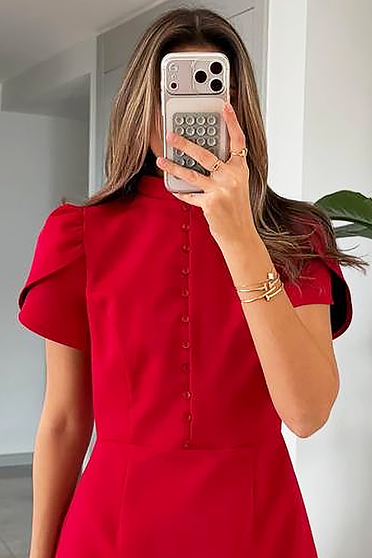 - Model ima elegantan kroj, dugmad, kragnu i kratke pufnaste rukave.