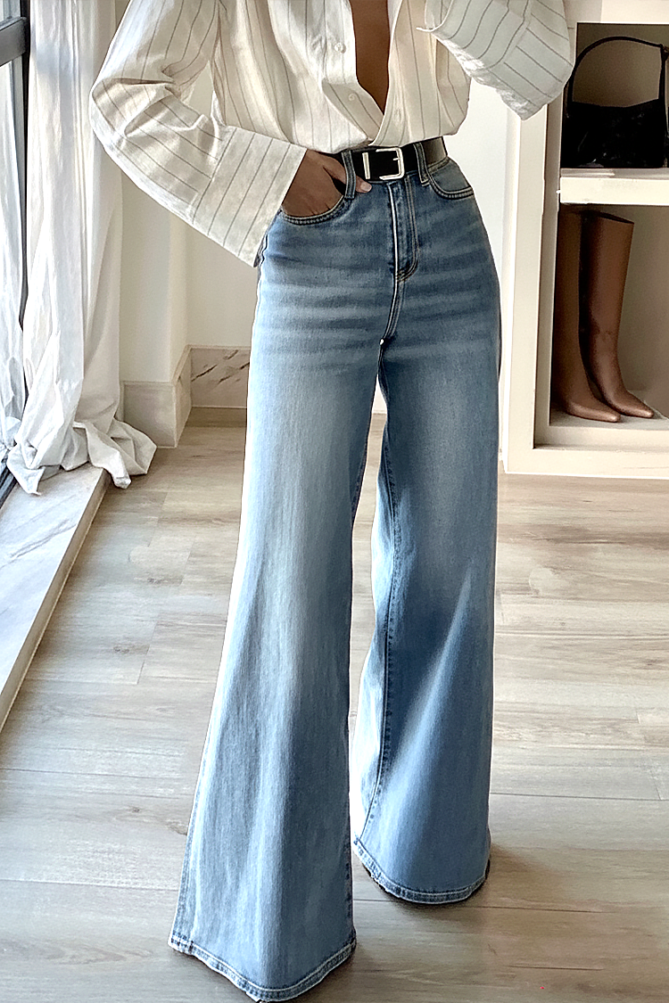 • Model ima visok struk, široke nogavice i svetloplavi dezen.
