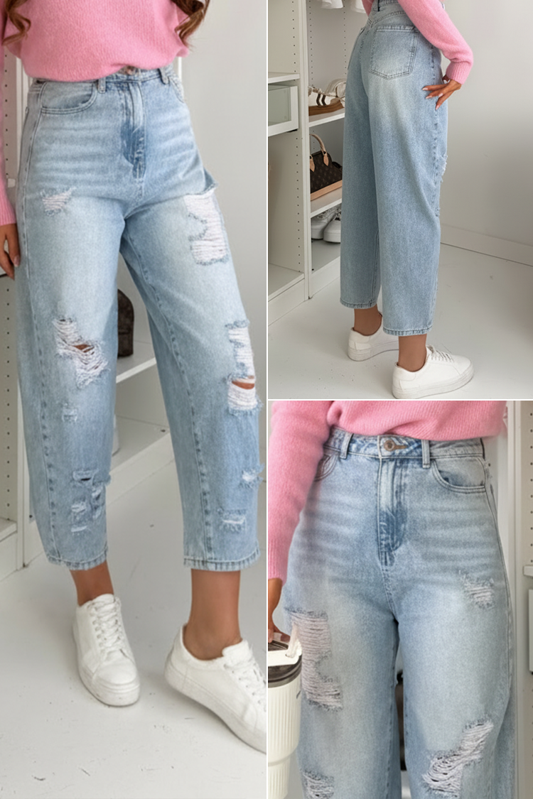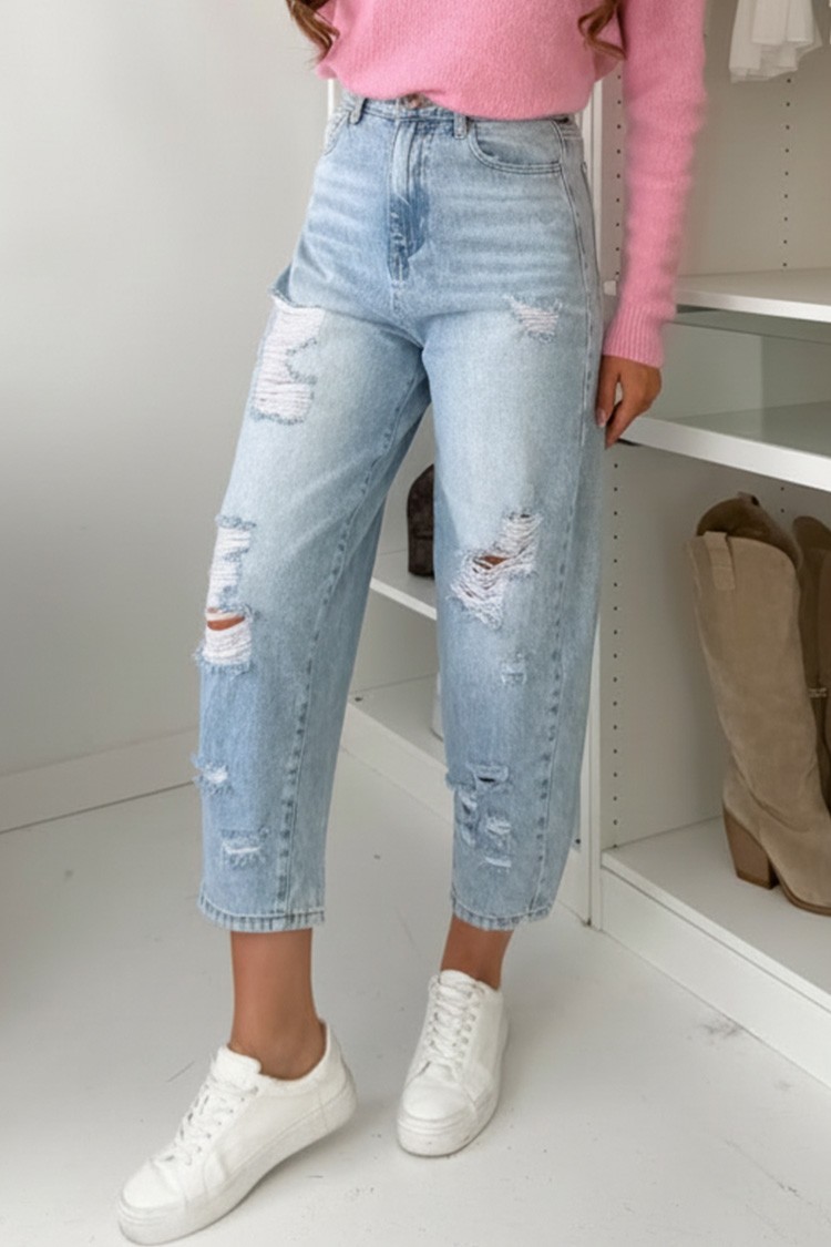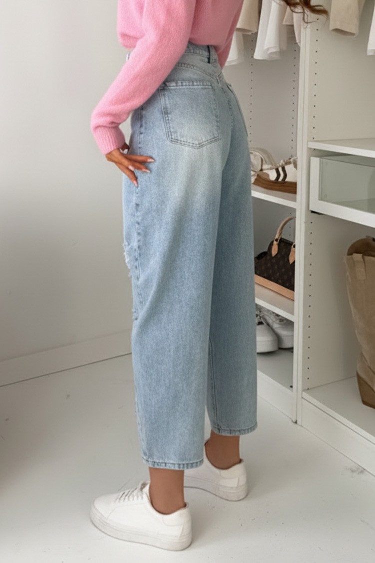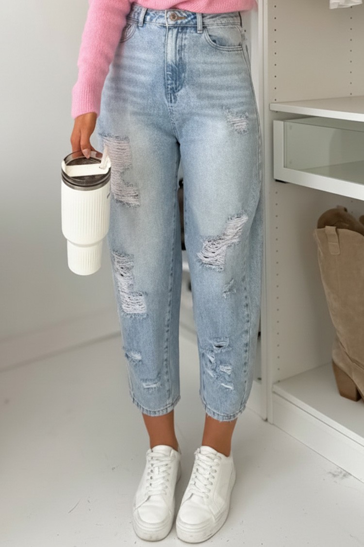 - Model ima visok struk, džepove, ležeran kroj, moderan pocepani efekat i svetloplavi dezen.