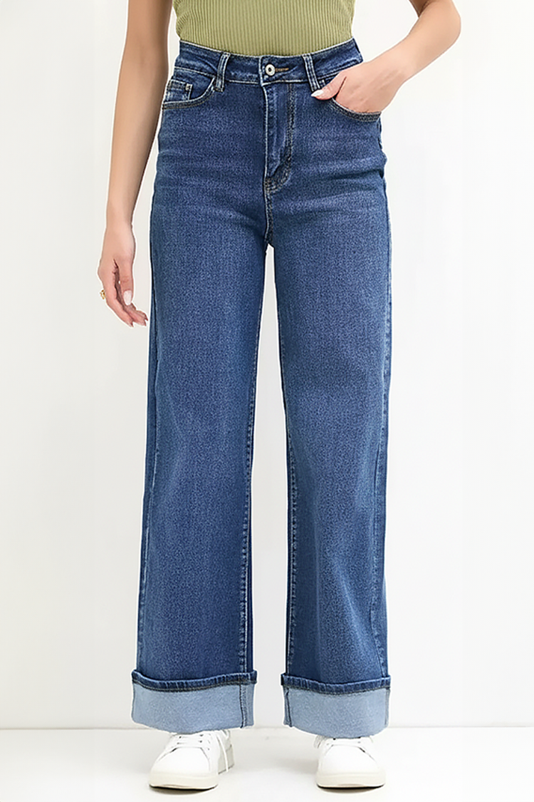 - Model ima visok struk i rasklešen kroj i rub na nogavicama.