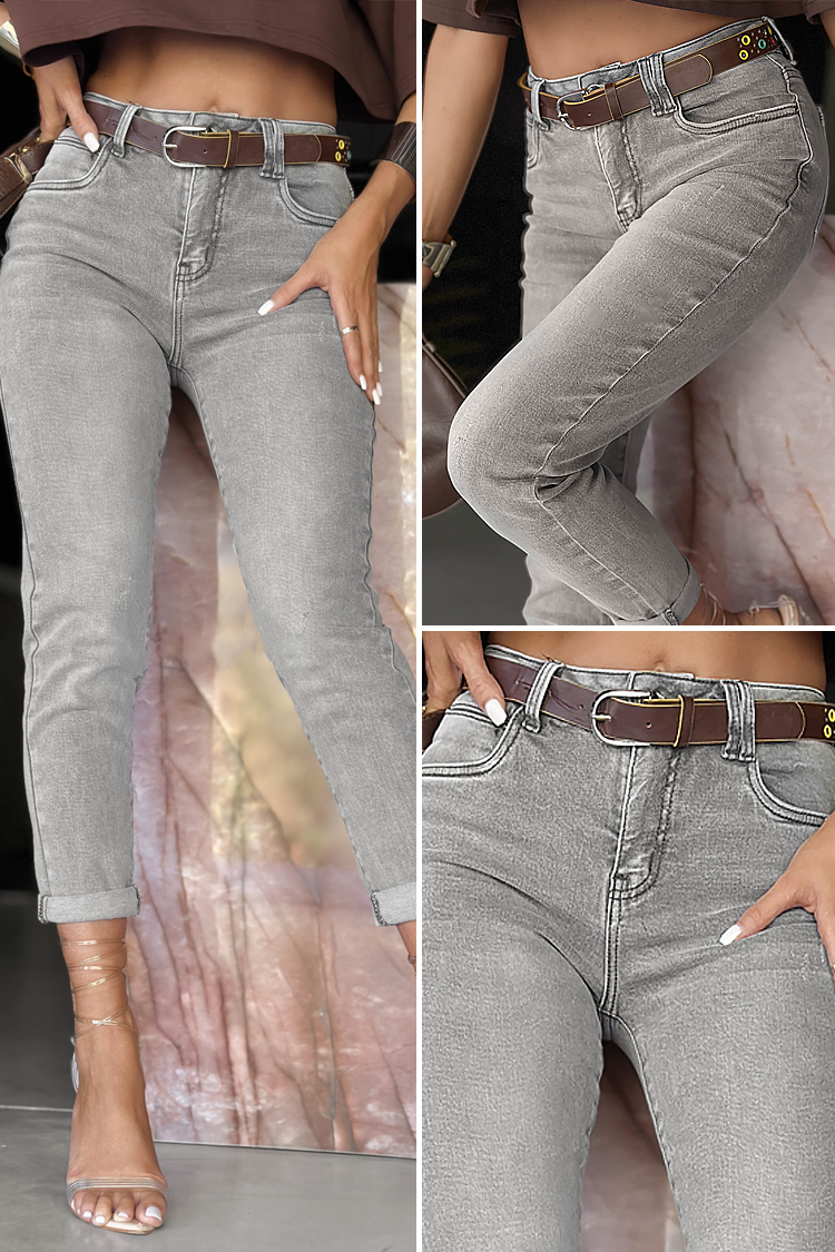 - Model ima visok struk, uski dizajn, svetlo sivi dezen i smeđi kaiš.