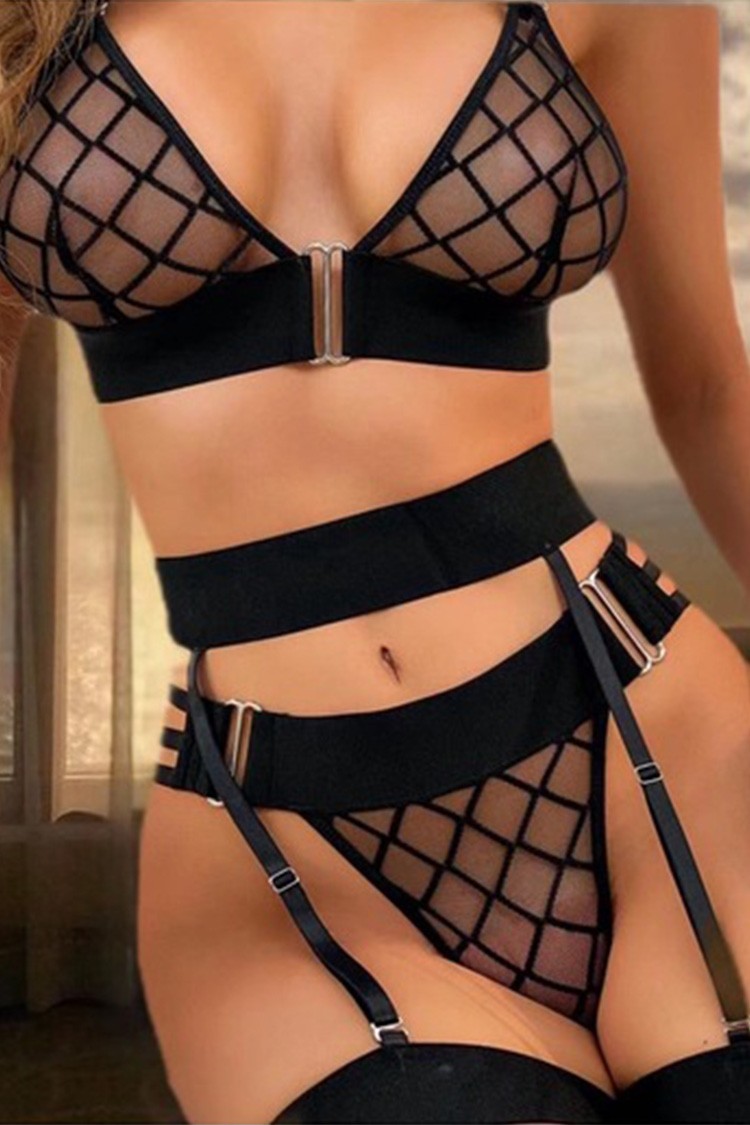- Erotski trodelni set donjeg veša u crnoj boji, koji kombinuje seksipil i samopouzdanje.