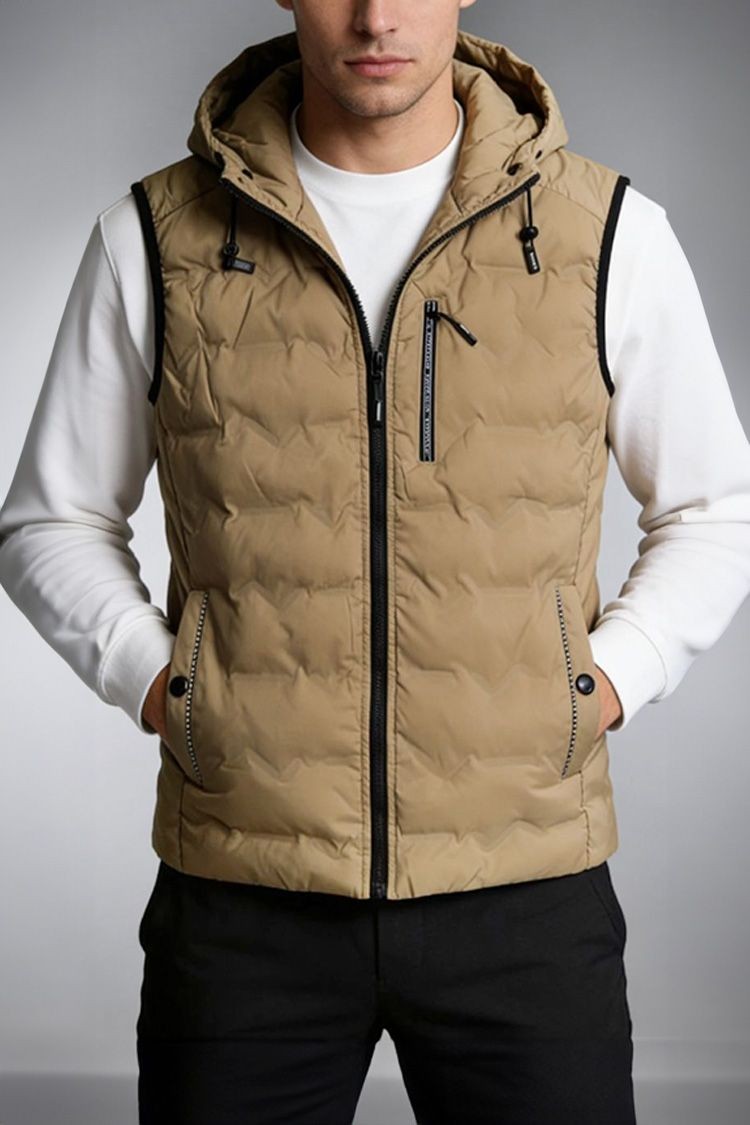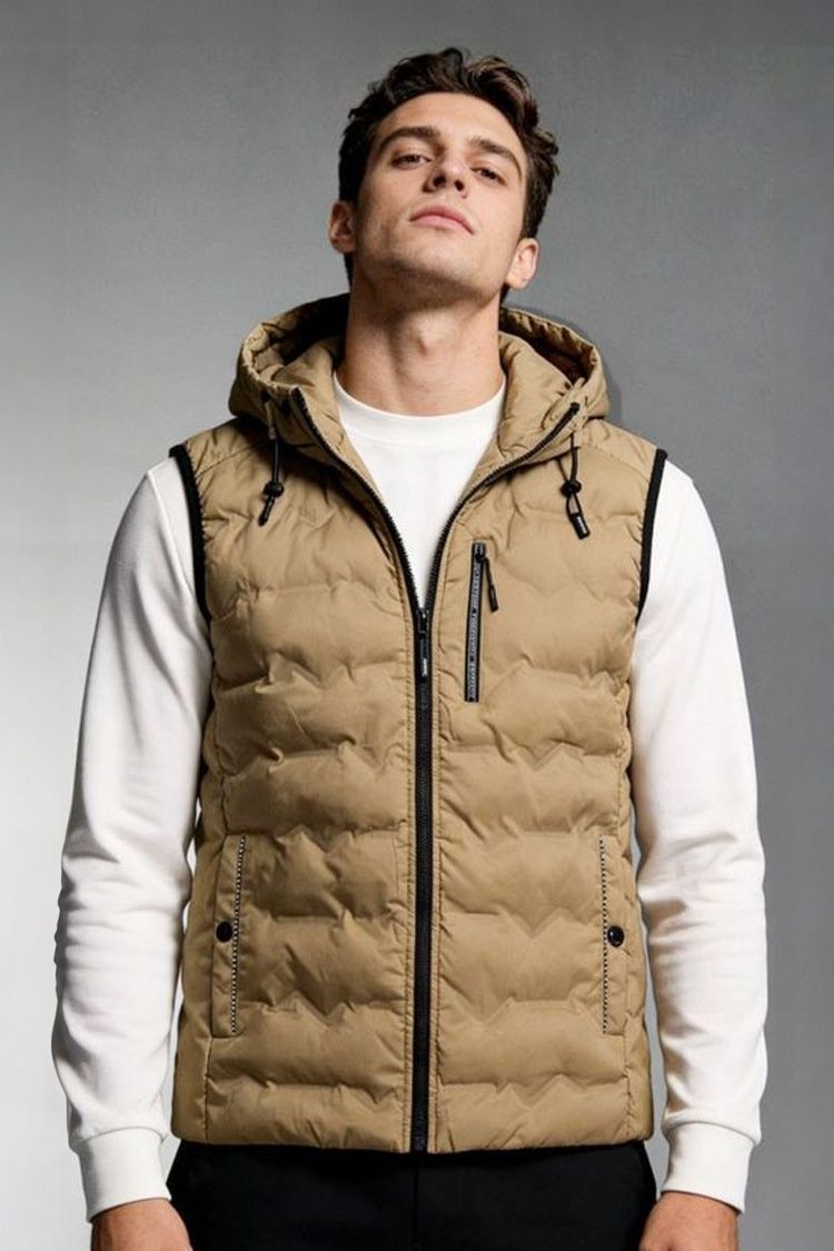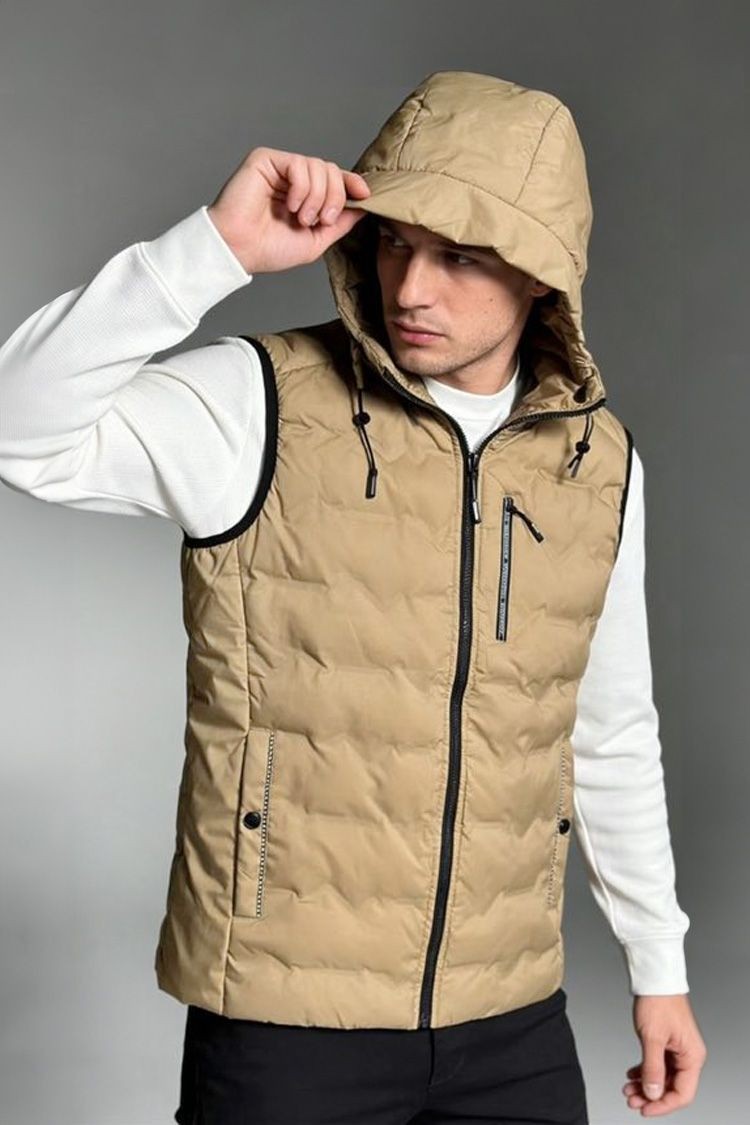 • Muški sportski prsluk u bež boji sa fiksnom kapuljačom sa vezicama, pogodan za svakodnevno nošenje.