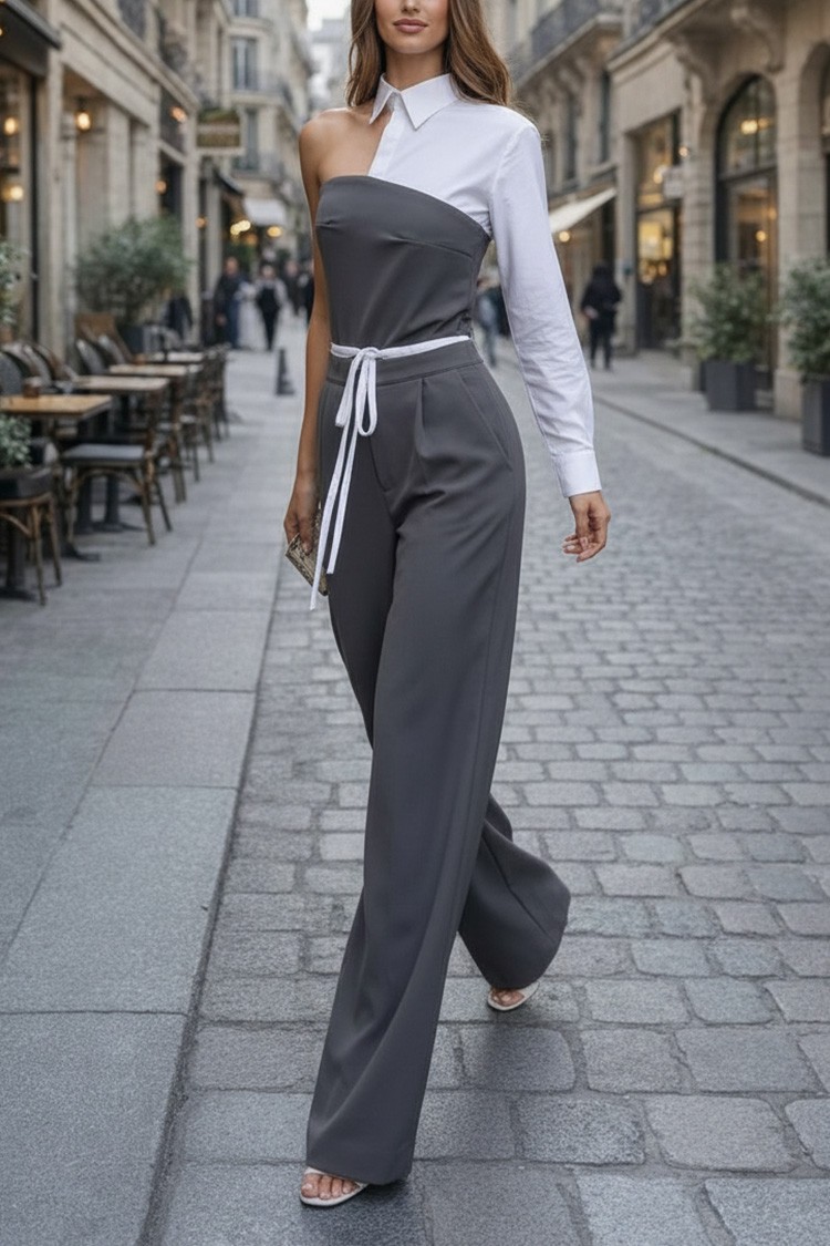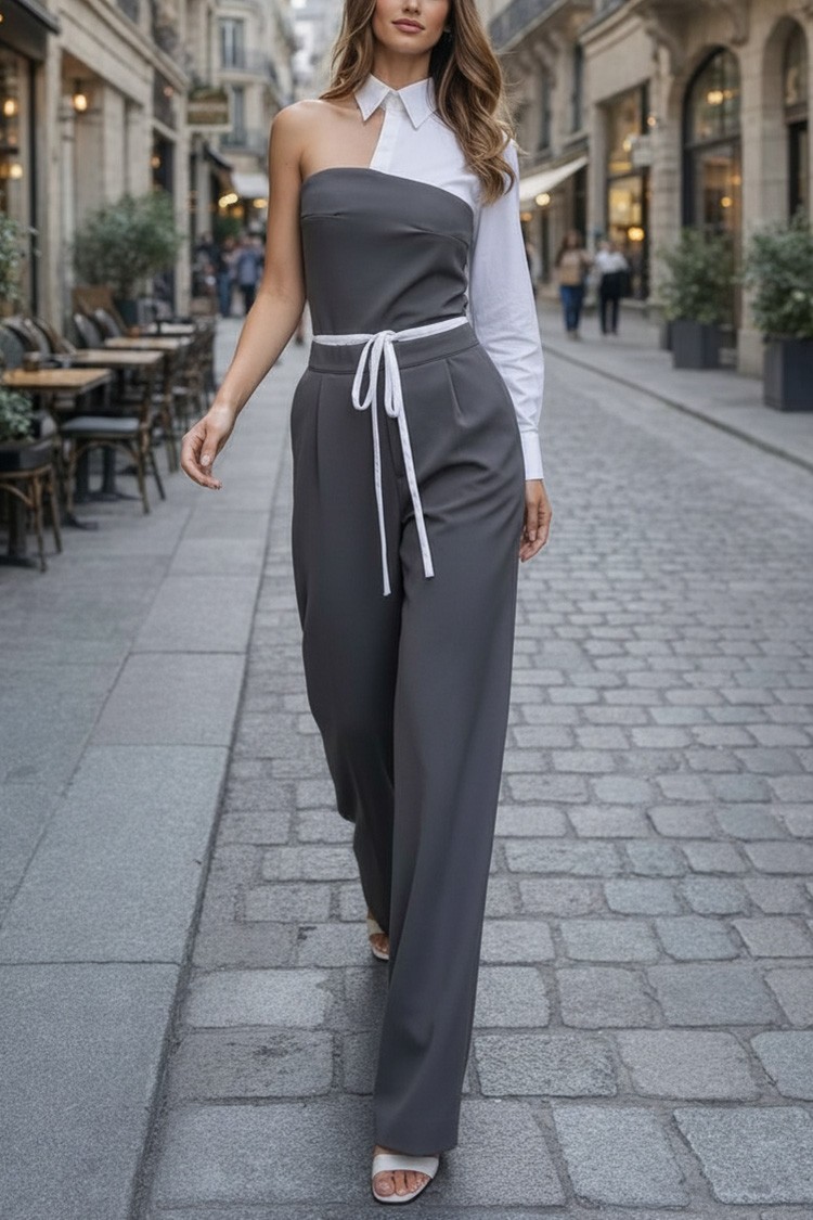 • Gornji deo je seksi top sa asimetričnim krojem, kragnom i kombinovanom tkaninom.
