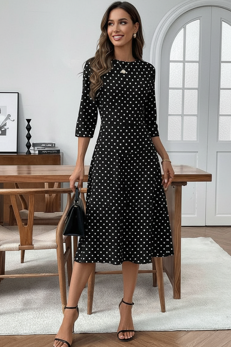 - Model ima zvonasti kroj, crnu boju i dezen na tufne.