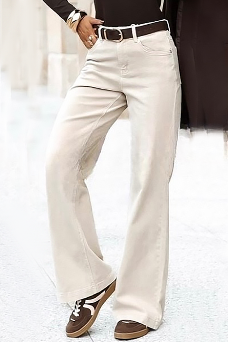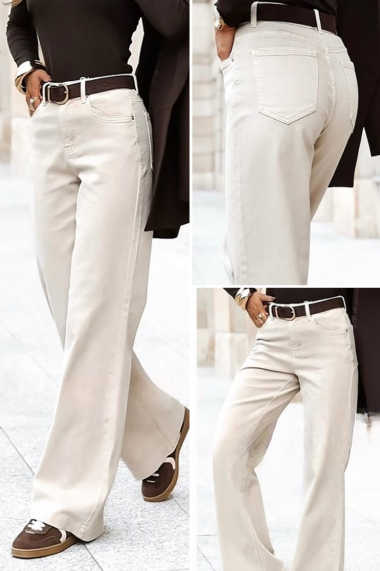 - Model ima visok struk i široke nogavice.