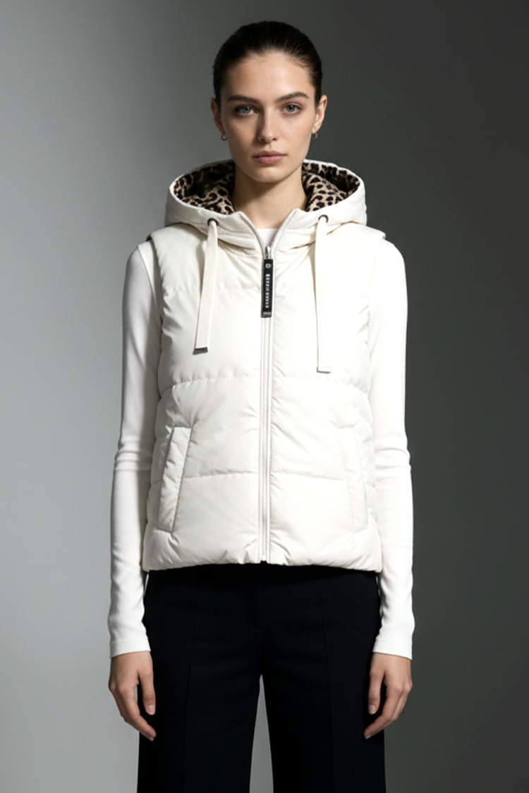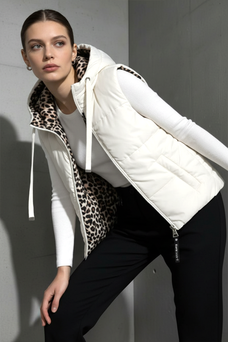 - Prsluk ima klasičan kroj, kapuljaču, rajsferšlus po celoj dužini i postavu sa leopard printom.