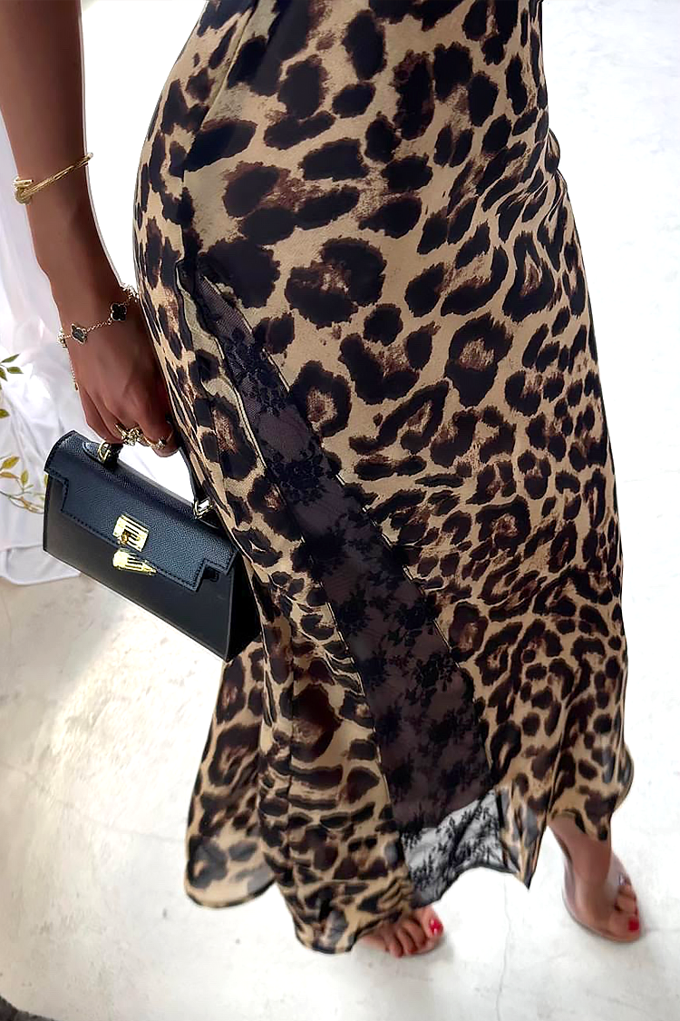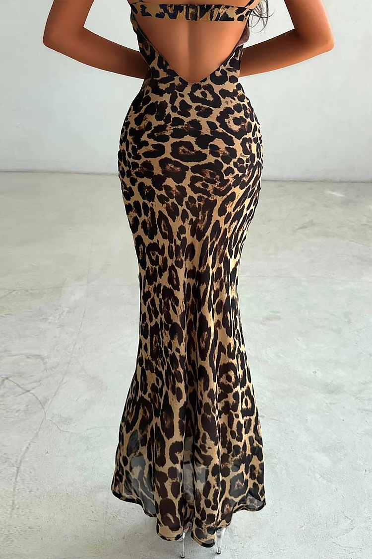 - Model ima uski kroj, tanke bretele, gola leđa i leopard print.