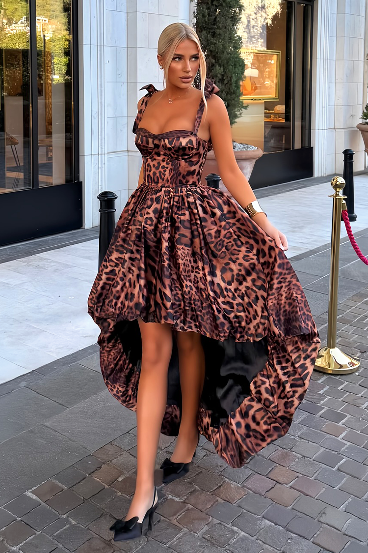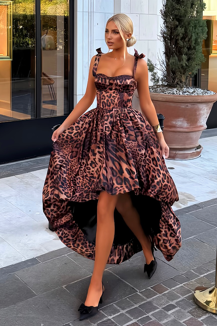 - Model ima slobodan kroj, trendi bretele i leopard print.