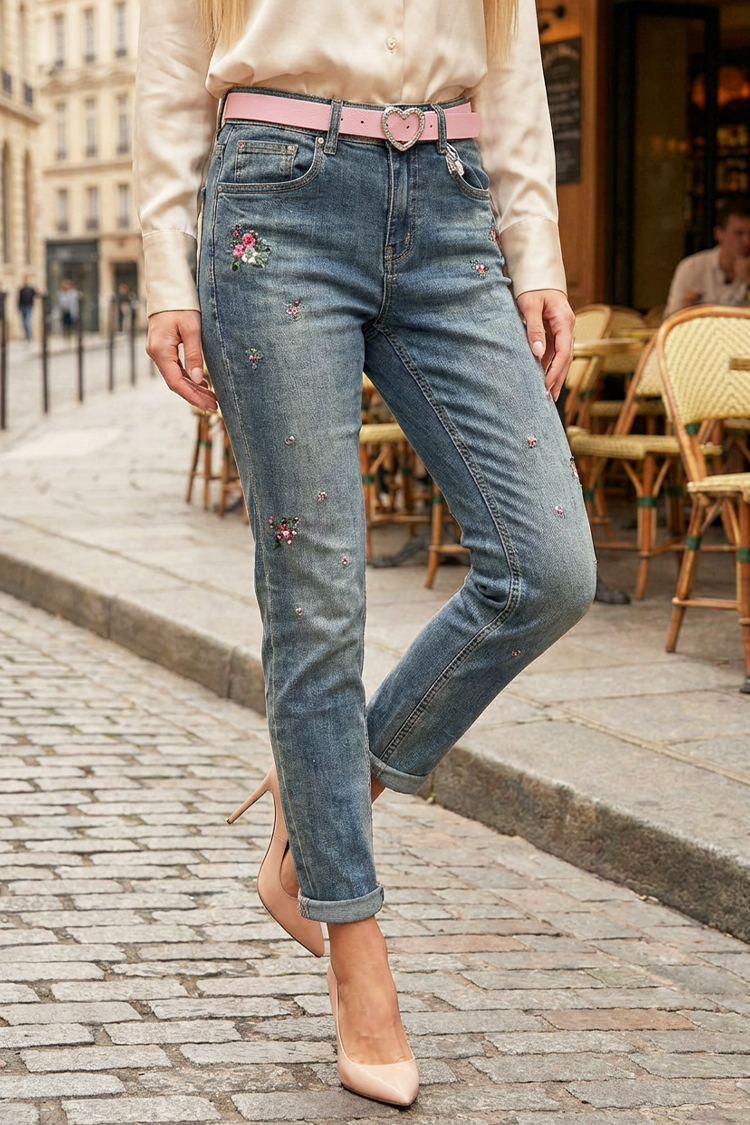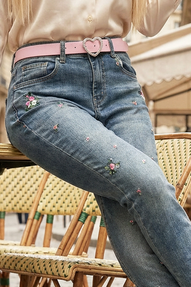 - Model ima visok struk, uski kroj, ružičasti kaiš i cvetni vez.