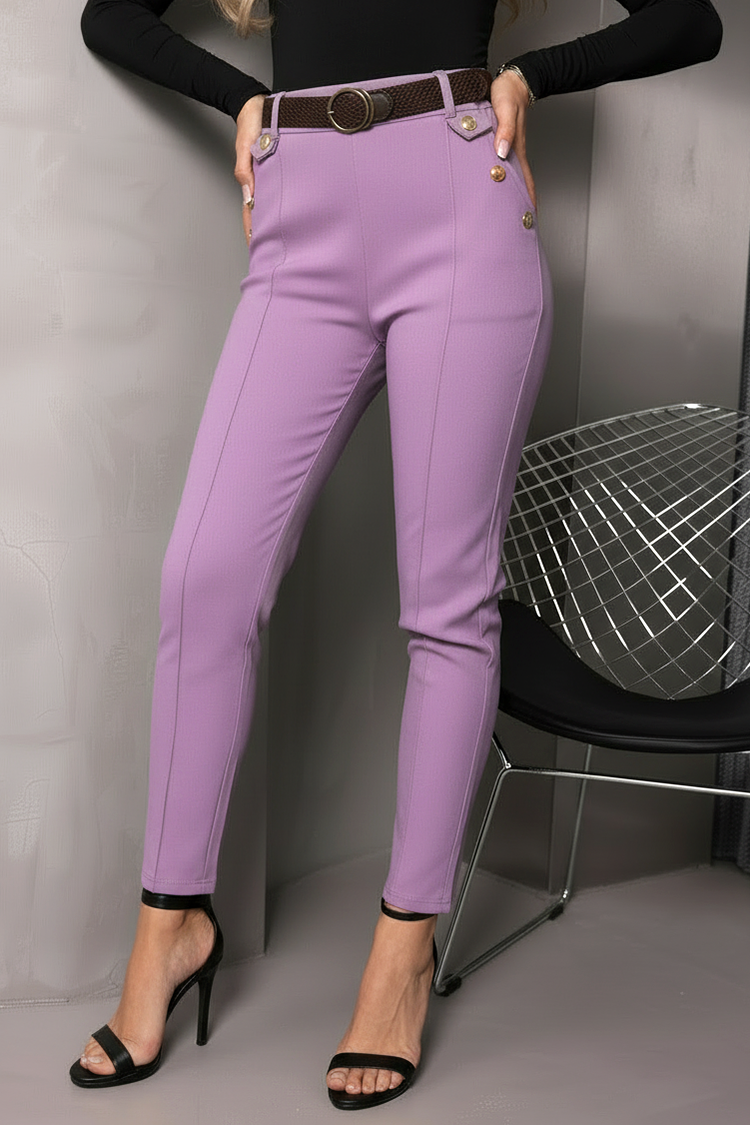 - Model ima visok struk, uski kroj, efektnu dugmad i kaiš.
