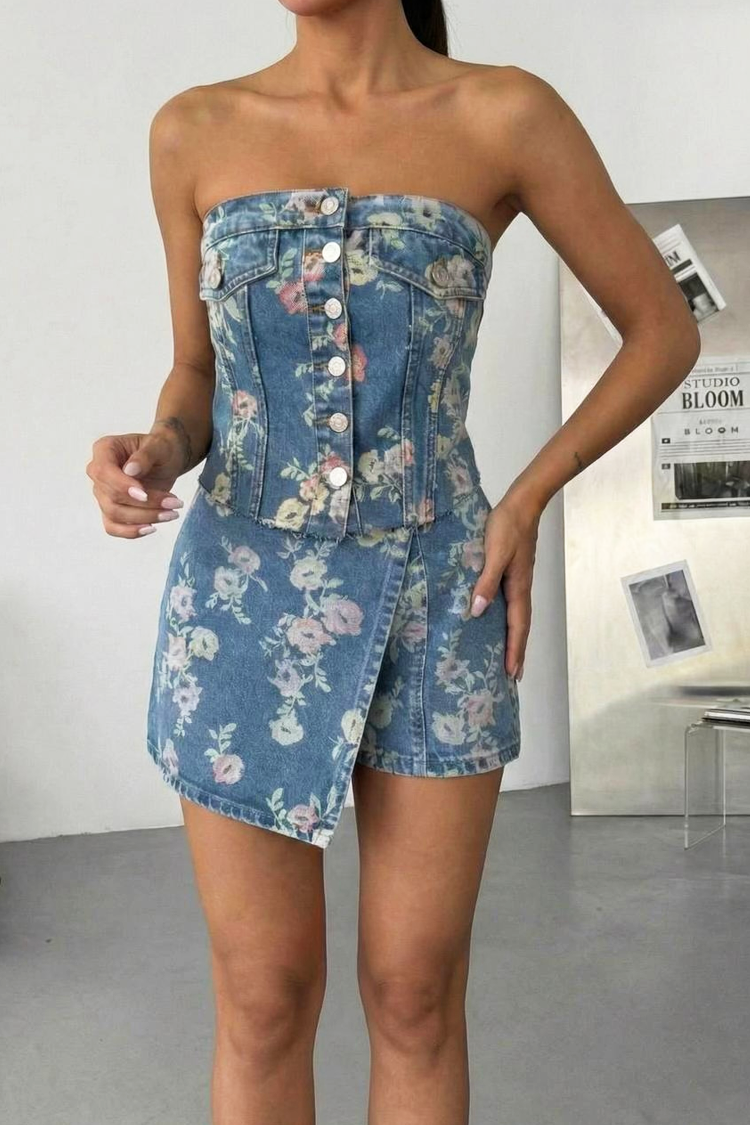 - Elegantni dvodelni komplet: korset i suknja - pantalone u trendi cvetnom dezenu.