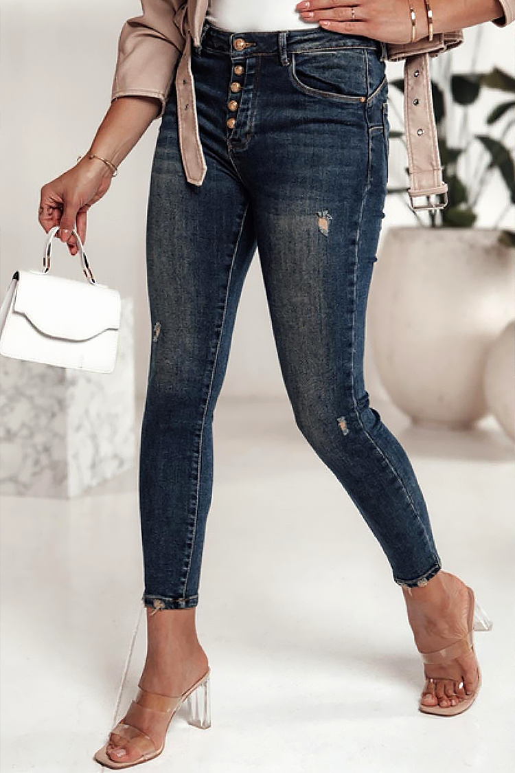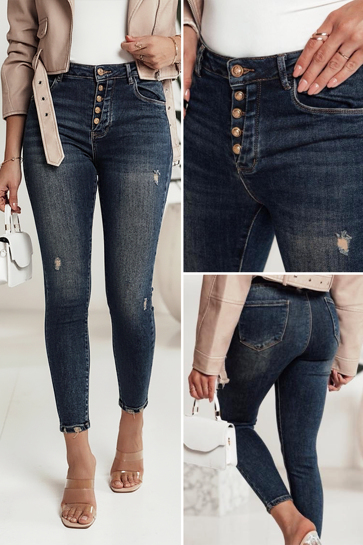 - Model ima visok struk, uski kroj i efektnu dugmad na prednjoj strani.